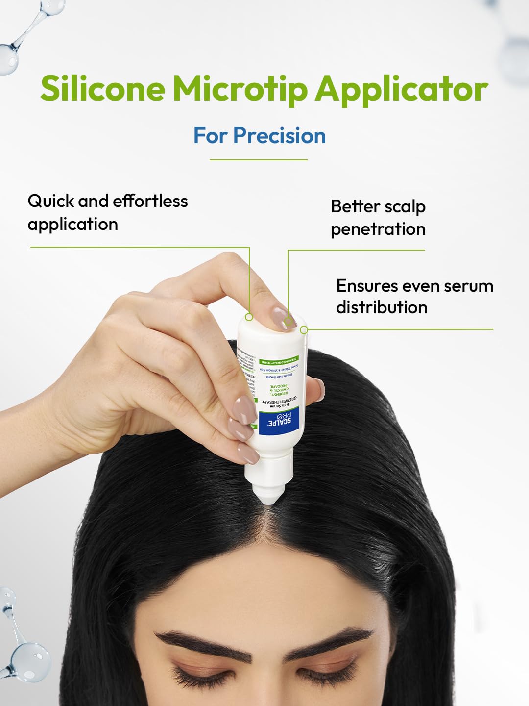 SILICONE MICROTIP SCALP APPLICATOR The serum comes with a Silicone Microtip Applicator that helps in quick precise & effective application to the scalp.