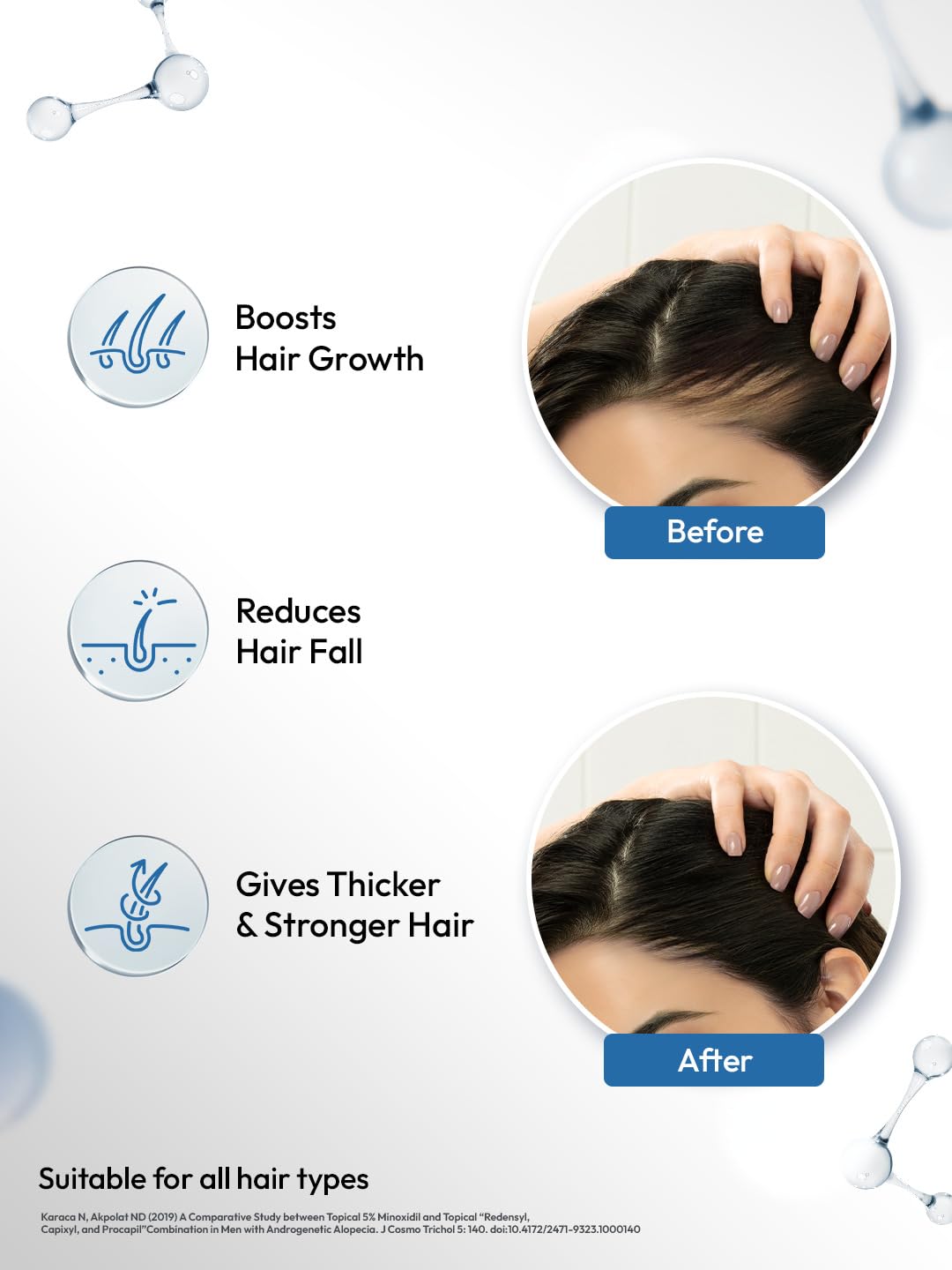 USAGE OF THE SERUM To use the serum scalp applicator has to be attached to the bottle. The serum should be directly applied onto the scalp with the help of the applicator and left overnight. Suitable for all hair types.