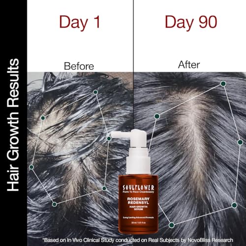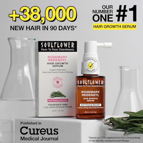 Soulflower Hair Growth Serum, Rosemary Oil, 3% Redensyl, 4% Anagain, Caffeine, Melanogray, Biotin, Rice Water, Clinically Tested on Real people, Hair growth & Hair fall control for Women & Men | 30ml