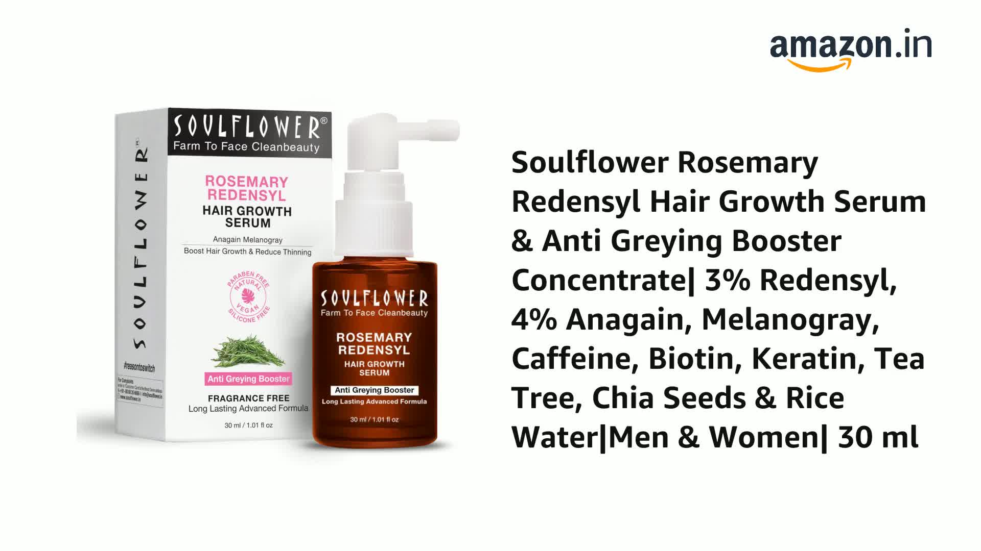 HAIR GROWTH : Soulflower Rosemary Redensyl Hair Growth Serum is a unique formulation to helpto promote thicker denser fuller hair and healthy scalp. It utilises a concentration of Redensyl Anagain Rosemary Oil Rice Water Chia Seeds Melanogray Caffiene Ker