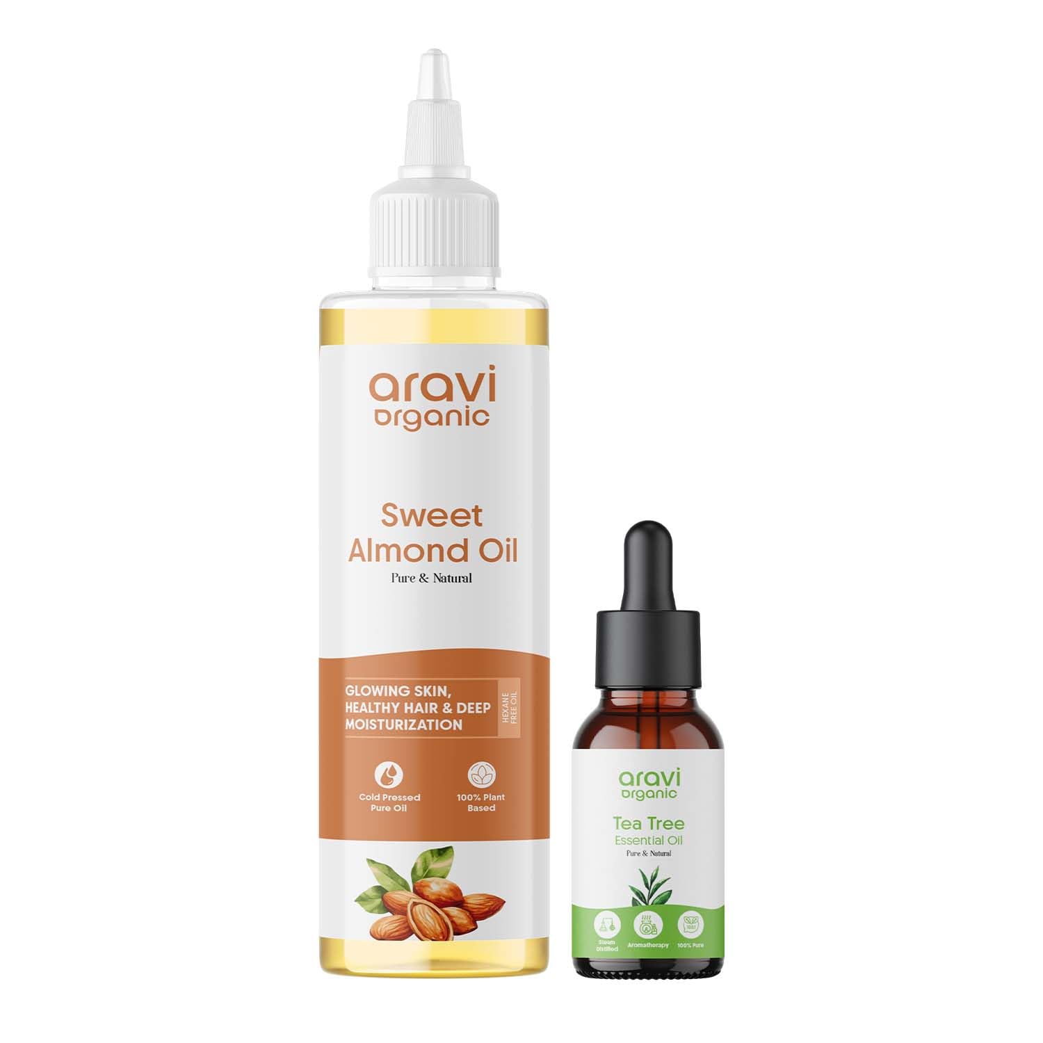 100% Pure & Organic: Aravi Organic Almond Oil and Tea Tree Essential Oil with no additives or chemicals.