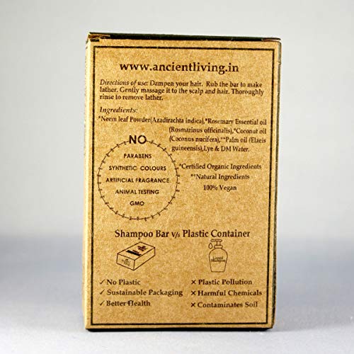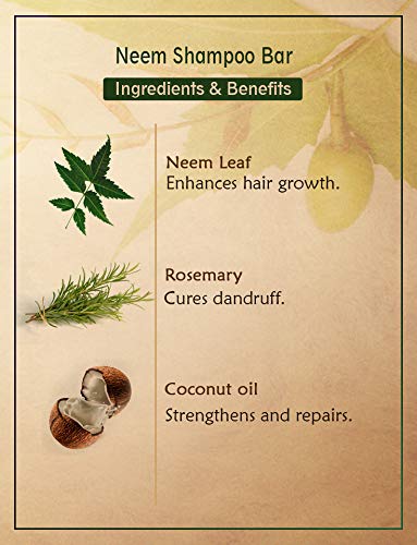 Ancient Living Neem Shampoo Bar is the perfect solution to all your scalp problems! It gently cleanses out all the impurities fights scalp problems and deeply conditions your hair. It is a storehouse of vitamins E C and A which are known for their nourishing properties. Infused with neem leaf powder it reduces hair fall and enhances hair growth. Rosemary essential oil eliminates dandruff and lifts off exhaustion with its refreshing smell. Coconut oil strengthens and repairs your hair whereas palm oil deeply nourishes your hair giving you beautiful lustrous locks. Application: Wet your hair and apply the shampoo bar directly on your scalp. Gently clean your hair by massaging it all over your scalp and rinse. Shampoo bars are a great environment-friendly option and help you save some bucks at the same time! Their minimal packaging and shape make it a zero waste alternative. Since they don't come in the liquid form like the traditional shampoos they last a long time. Their compact size and light weight make them perfect for travel! BENEFITS NEEM LEAF POWDER · Reduces hair fall and enhances hair growth. · Moisturizes dry and frizzy hair. · Fights scalp impurities while improving scalp health. · It prevents baldness. ROSEMARY ESSENTIAL OIL · It gets rid of dandruff. · It nourishes your hair and refreshes your senses.
