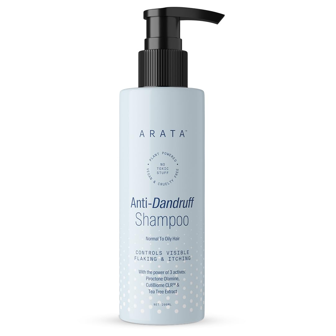 Arata Anti-Dandruff Shampoo is uniquely formulated with potent actives such as tea tree oil and CutiBiome CLR â to help control dandruff scalp itchiness oiliness and flaking for everyone with normal to oily hair. This everyday formula gently cleanses your hair and reduces visible flakes after a single wash.