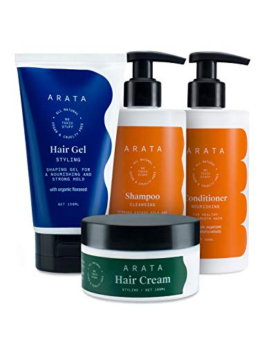 Arata Natural Hair Care Essentials For Women & Men With Cleansing Shampoo (300 ML), Conditioner (300 ML), Hair Gel (150 ML) & Hair Cream (100 ML) | All-Natural, Vegan & Cruelty-Free | Plant-Based, Non-Toxic Hair Cleansing & Styling