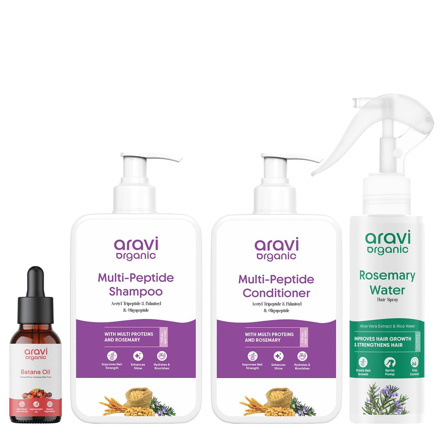 Transform your hair care routine with the Aravi Organic Batana Hair Oil 15ml + Multi Peptide Shampoo + Conditioner + Rosemary Water Spray set. This all-in-one hair care kit is designed to provide deep nourishment promote hair growth and restore strength hydration and shine to your hair.