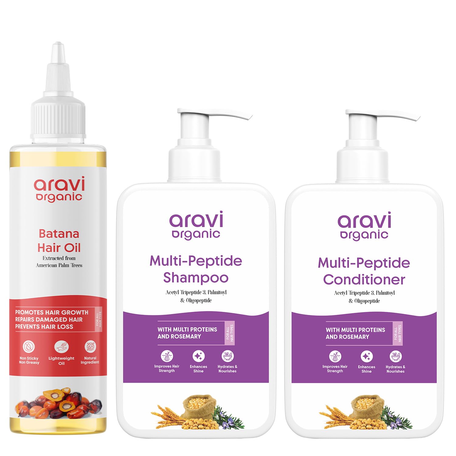 Aravi Organic Batana Hair Oil (200ml) & Multi Peptide Shampoo & Conditioner Advanced Hair Strengthening & Repair Combo for Hair Growth & Shine
