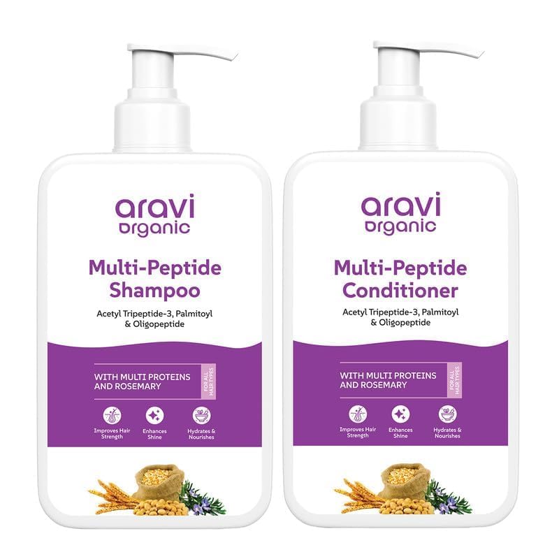 Aravi Organic Multi Peptide Shampoo is specially formulated for effective hairfall control. Formulated with a unique blend of peptides this advanced hair care solution nourishes your scalp promotes hair growth and reduces hair thinning. This sulphate and paraben-free shampoo are designed to provide a gentle yet effective cleansing experience while promoting healthier hair. Enriched with natural botanicals and multi-peptide technology it is suitable for all hair types.Aravi Organic Multi Peptide Conditioner is specially formulated for effective hairfall control. Formulated with a unique blend of peptides this advanced hair care solution nourishes your scalp promotes hair growth and reduces hair thinning. This sulphate and paraben-free shampoo are designed to provide a gentle yet effective cleansing experience while promoting healthier hair. This sulphate and paraben-free shampoo is designed to provide a gentle yet effective cleansing experience while promoting healthier hair. Enriched with natural botanicals and multi-peptide technology it is suitable for all hair types.