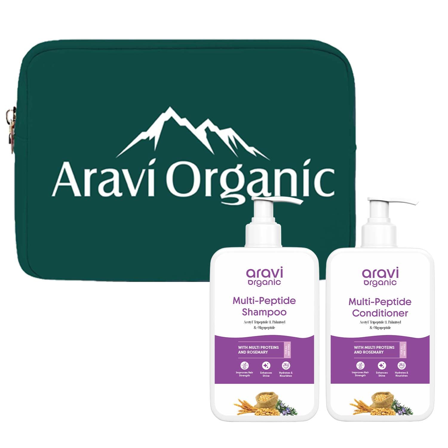 Strengthen and rejuvenate your hair with the Aravi Organic Multi Peptide Shampoo & Conditioner Set with Travel Pouch. Formulated with a powerful blend of multi-peptides and natural ingredients this hair care duo helps to boost hair growth repair damage and deeply hydrate every strand.