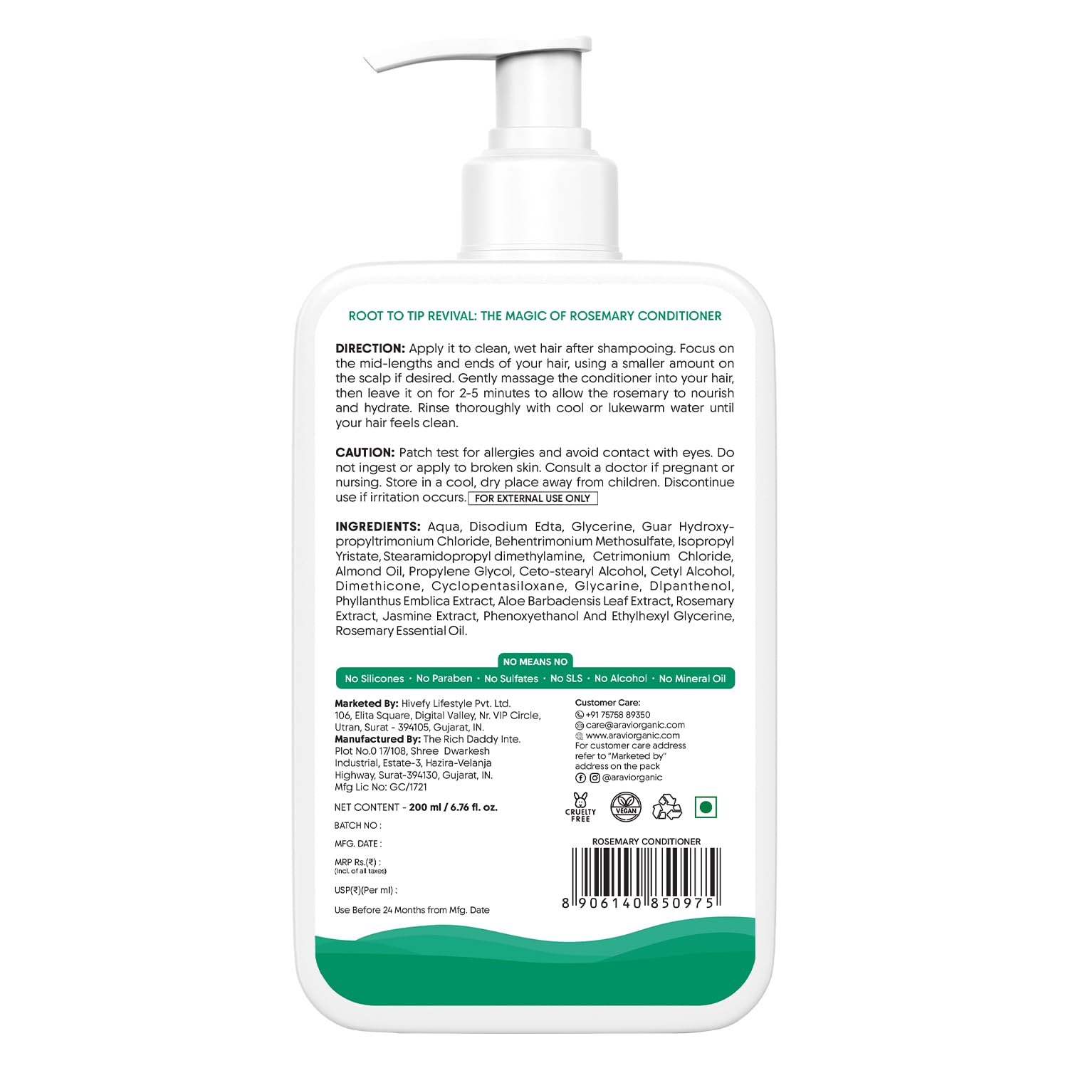 Aravi Organic Rosemary Hair Growth Conditioner - Enriched with Rosemary Methi Dana & Hibiscus - For All Hair Types - For Men & Women - Sulfate & Paraben Free - 200 ml