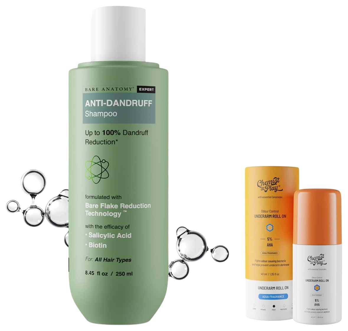 Bare Anatomy Anti Dandruff Shampoo | Reduces Up to 100% Dandruff and Strengthens Hair | Derma Approved Shampoo with Salicylic Acid & Biotin | Shampoo For All Hair types | For Women And Men | 250mlEnriched with Bare Flake Reduction Technology the EXPERT Anti-Dandruff Shampoo targets both oily & dry scalp dandruff up to 100%. It also hydrates the scalp & reduces itchiness and irritation. How to Use: Rinse your hair thoroughly. Apply the required amount of shampoo on your scalp and along the length of your hair. Massage with your fingers or a wide-mouth comb. Wash your hair and then style as usual. About Bare Anatomy: Bare Anatomy cares about you and the products you use for your hair. We aim to provide you with the best quality products free from all harmful chemicals. Each Bare Anatomy EXPERT product goes through extensive clinical trials before being introduced to the consumer. Further all our products are safe to use. All our products are: Dermatologically tested Free of toxins (parabens sulfates phthalates etc.) Cruelty-free Vegetarian Bare Anatomy EXPERT products have been designed and formulated after 3 years of extensive research by creating over 1 million unique formulations and collecting over 10 million real consumer insights to tackle the most-relevant hair concerns for Indian consumers. Our research is backed by data and the ingredients we use are backed by science.Chemist at Play UnderArm Roll-On with 5% AHA Lactic Acid & 1% Mandelic Acid | Prevents Body Odour Brightens Skin & Exfoliates Underarm | For Sensitive Skin | Aqua Fragrance | Alcohol Free - 40mlRaise up your hands as our Under Arm Roll On Is Here!With 4% Lactic Acid + 1% Mandelic Acid being its hero ingredients this daily use roll on is perfect if you wish to sport lighter even-toned underarms; it evens out the skin tone treats hyperpigmentation & dark spots and also lightens dark skin.It also leaves a refreshing fragrance behind so you can go on about your day without a care in the world. Apply it daily post-shower and enjoy a sweat & odour-free day ahead of you.All our ceramides-based essentials are based on 3Bs of skincare science;Our products are Bio-Compatible in nature meaning our products absorb easily into the skin to work their magic.Our products are Bio Effective on the skin meaning they are specially formulated to target specific skin concerns.Our products are made with Botanical Actives aka plant-based ceramides (phytoceramides).