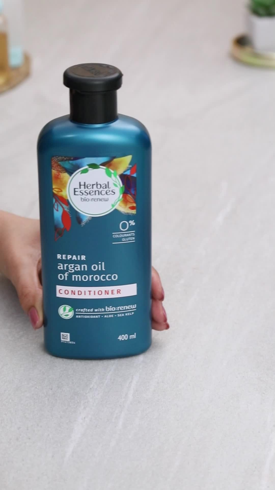 Repair damaged hair with Herbal Essences bio:renew ARGAN OIL OF MOROCCO CONDITIONER to leave it smoother and softer.Crafted with bio:renew our signature blend of essential antioxidants aloe and sea kelp ARGAN OIL OF MOROCCO CONDITIONER will leave your hair shining brighter feeling repaired and having freedom from frizz to bring it back to life in just 21 days. Free of parabens gluten and colorants from the first pop of the cap it will take you on a multi-layered scent experience to the warm sands of Morocco. Immerse yourself in the scent of creamy vanilla followed by a burst of fizzy citrus and lingering exotic spices.
