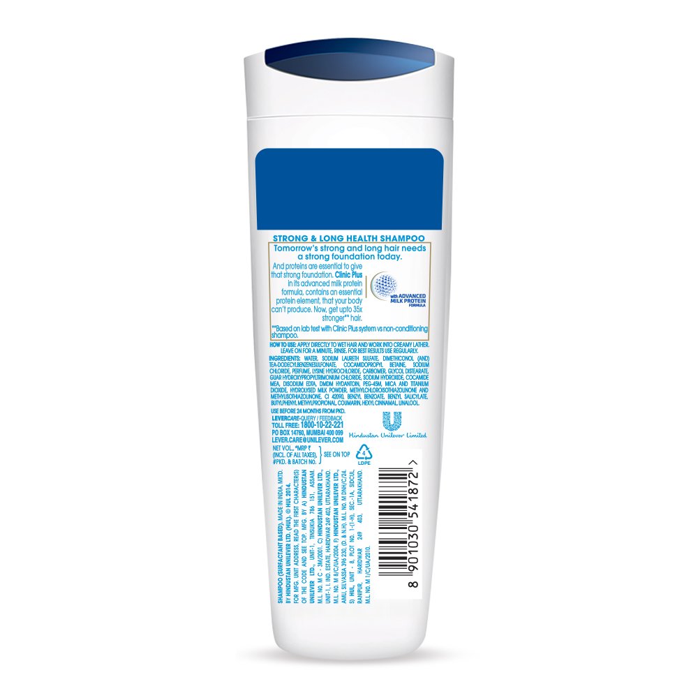 Tomorrow's strong and long hair needs a strong foundation today. Clinic Plus Strong & Long Health Shampoo with the goodness of milk protein makes your hair 35 x* stronger. Its advanced milk protein formula contains an essential protein element which body cannot produce. This essential protein penetrates into each hair strand providing nourishment every time you wash your hair with Clinic plus shampoo. For best results wash your hair daily with Clinic Plus Strong & Long Health shampoo. Use Clinic Plus conditioner every time you shampoo for soft and silky hair.