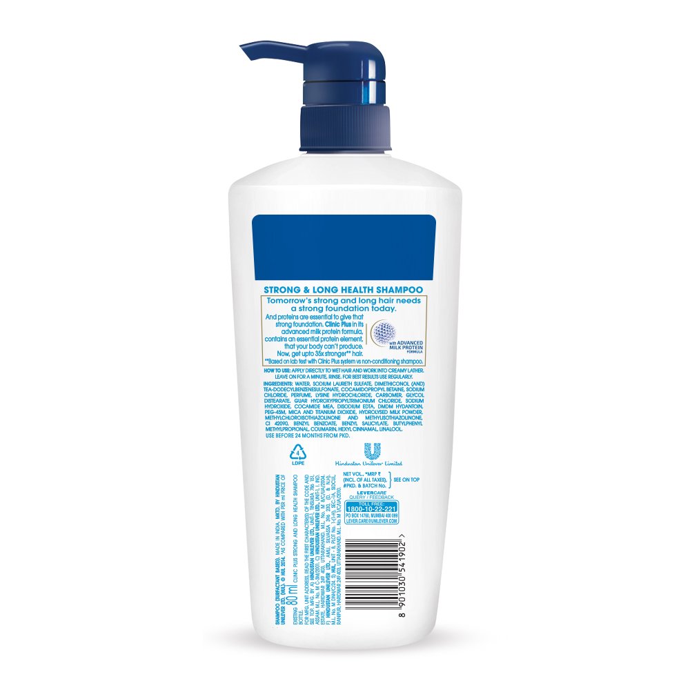 Tomorrow's strong and long hair needs a strong foundation today! Clinic Plus Strong & Long Health Shampoo with the goodness of milk protein makes your hair 35 x* stronger. Its advanced milk protein formula contains an essential protein element which body cannot produce. This essential protein penetrates into each hair strand providing nourishment every time you wash your hair with Clinic plus shampoo. For best results wash your hair daily with Clinic Plus Strong & Long Health shampoo. Use Clinic Plus conditioner every time you shampoo for soft and silky hair.
