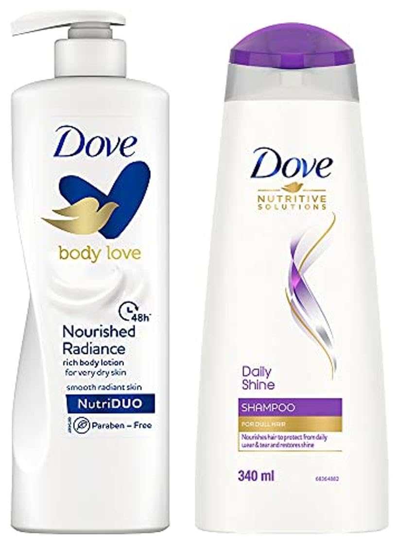 Dove Body Love Nourished Radiance Body Lotion For Very Dry Skin 48hrs Moisturisation Paraben Free with Plant Based moisturiser Soft Radiant Skin 400mlDove Loves Your Body Unconditionally. Dove knows that very dry skin can be tricky and itâs not always easy to keep your skin feeling and looking its best. But thereâs no need to give up. Presenting Dove Body Love Nourished Radiance Body Lotion . The rich body lotion with Its unique Nutri duo Paraben Free Formula goes beyond the surface 10 layers** deep to nourish your skin from Within. Result ? Irresistibly Smooth visibly Radiant SkinAnd thatâs not all. This Body care is with plant based moisturiser & is dermatologically tested suitable for every day and perfect for everyone. Its Unique Formulation Gives 48hrs Long Lasting Moisturisation. For an indulgent treat youâll be dreaming of for days simply massage this body lotion on your skin on lower legs arms elbows and knees Smooth it on in wide circles gradually getting wider until absorbed. The Lotion absorbs quickly in the skin and making you Experience the Goodness of Dove that lasts.Try applying your lotion before bed or stepping out everyday and let your body experience the body love it deserves. Dove does not test on animals anywhere in the world and is PETA certified Cruelty-Free. ** Within Stratum CorneumDove Daily Shine Shampoo 340 ml For Dry and Damaged Hair Strengthening Shampoo Gives Smooth and Strong Hair - Mild Daily Shampoo for Men & WomenThe mystery of how to get shiny hair isn't a tricky one to solve. The key to getting shiny damage free hair we all long for is making sure your hair is nourished from the start of your routine. That's where Dove Daily Shine Shampoo comes in. Dove Daily Shine Shampoo with Nutritive Serum builds a protective shield around the hair fiber and defends your hair from daily hair damage. It is a gentle hair cleanser that keeps your hair looking healthy and lustrous. It is mild on your scalp but gives protection from the aggression your hair faces every day. Its Nutritive Serum absorbs into the hair strands to keep them beautifully nourished and shiny this Dove shampoo surrounds your hair with a protective shield defending it from everyday stresses like brushing & damage. And not only is it gentle enough to use every day over time Dove Daily Shine Shampoo makes your hair better*. So as well as cleansing from roots up it helps make your hair look healthy too. The result? Beautifully shiny strong and silky hair which is everything you want it to be. *Based on lab test with Dove Daily Shine System vs non-conditioning shampoo