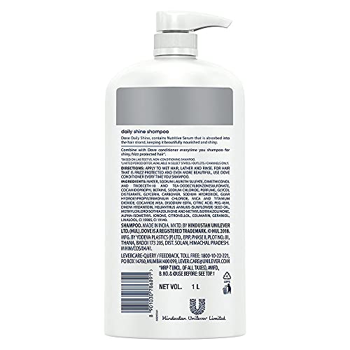 Dove Daily Shine Shampoo 1 L For Damaged or Frizzy Hair Makes Hair Soft Shiny And Smooth - Mild Daily Shampoo for Men & WomenThe mystery of how to get shiny hair isn't a tricky one to solve anymore. The key to getting shiny damage protected hair is making sure your hair is nourished from the start of your routine. That's where Dove Daily Shine Shampoo comes in. Dove Daily Shine Shampoo with Nutritive Serum builds a protective shield around the hair fiber and defends your hair from daily hair damage. It is a pleasant hair cleanser that gives you voluminous and healthy looking hair. With sunflower oil this Dove shampoo not only cleans your hair but gives you voluminous hair. It gives protection from the aggression your hair faces every day. Its Nutritive Serum formula absorbs into the hair strands to keep them beautifully nourished and shiny this Dove shampoo surrounds your hair with a protective shield defending it from everyday stresses like brushing damage. With regular use Dove Daily Shine shampoo makes your hair smooth shiny and beautiful looking. This Dove shampoo cleanses from roots up as well as it helps make your hair look healthy. The result? Beautifully shiny strong and silky hair which is everything you want it to be. *Based on lab test with Dove Daily Shine System vs non-conditioning shampooDove Gentle Exfoliating Nourishing Body Wash Mild Cleanser Moisturizes Skin Balances Ph For All Skin Type 800 mlLooking for a body wash that cleans like a soap and moisturises like cream? Dove Nourishing Freshness with Exfoliating Beads does both. It's enriched with a gentle exfoliating formula and Doveâs signature ¼ moisturizing cream to give you softer smoother skin after every shower. Its NutriumMoisture technology and mild cleansers penetrates upto 3 layers deep to help your skin retain its natural moisture leaving you with nourished healthier looking skin. It's mild pH-balanced formula makes it a great body wash for dry skin unlike typical bathing soap or shower gel. Dove Body Wash nourishes deep into the surface layers of the skin and helps strengthen your skinâs moisture barrier. For best results squeeze the moisturizing body wash into your hand or onto a loofah and work it into a rich creamy lather. Massage it over your skin concentrating on areas that feel a little drier than usual. Rinse off revealing soft smooth nourished skin. There are 631 million beautiful women of all ages shapes sizes and skin tones in India. Yet we often see things one dimensionally. Together we can break the rules and represent the true diversity of beauty in India and empower each and every woman in India.