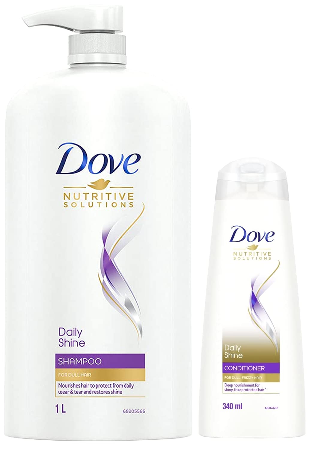 Dove Daily Shine Shampoo 1 L For Damaged or Frizzy Hair Makes Hair Soft Shiny And Smooth - Mild Daily Shampoo for Men & WomenThe mystery of how to get shiny hair isn't a tricky one to solve anymore. The key to getting shiny damage protected hair is making sure your hair is nourished from the start of your routine. That's where Dove Daily Shine Shampoo comes in. Dove Daily Shine Shampoo with Nutritive Serum builds a protective shield around the hair fiber and defends your hair from daily hair damage. It is a pleasant hair cleanser that gives you voluminous and healthy looking hair. With sunflower oil this Dove shampoo not only cleans your hair but gives you voluminous hair. It gives protection from the aggression your hair faces every day. Its Nutritive Serum formula absorbs into the hair strands to keep them beautifully nourished and shiny this Dove shampoo surrounds your hair with a protective shield defending it from everyday stresses like brushing damage. With regular use Dove Daily Shine shampoo makes your hair smooth shiny and beautiful looking. This Dove shampoo cleanses from roots up as well as it helps make your hair look healthy. The result? Beautifully shiny strong and silky hair which is everything you want it to be. *Based on lab test with Dove Daily Shine System vs non-conditioning shampooDove Daily Shine Conditioner 335/340 ml (volume may vary)DETANGLES HAIR GIVING IT AN UNBELIEVABLE SHINE Tangles and frizz not only make hair look dull but can also lead to increased hair breakage while combing. That's why shampoo alone is not enough. Use Dove Daily Shine Conditioner everytime after shampoo for detangled smooth hair with an unbelievable shine. Infused with Nutritive serum it detangles hair along the lengths adding shine taming frizz and making hair so smooth that your comb will slide through. For best results follow the below 3 steps: 1. SQUEEZE half to one spoon of Dove conditioner for shoulder length hair 2. SLIDE it from ears to tips where hair tangles and breaks more easily. 3. WAIT for a minute and WASH with water only thoroughly. Try Dove Daily Shine Conditioner for softer shinier easily manageable hair from the very first wash.
