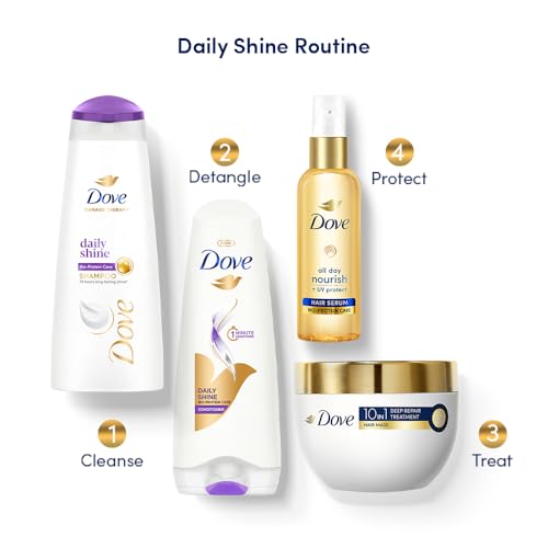 The mystery of how to get shiny hair isn't a tricky one to solve anymore. The key to getting shiny damage protected hair is making sure your hair is nourished from the start of your routine. That's where Dove Daily Shine Shampoo comes in. Dove Daily Shine Shampoo with Nutritive Serum builds a protective shield around the hair fiber and defends your hair from daily hair damage. It is a pleasant hair cleanser that gives you voluminous and healthy looking hair. With sunflower oil this Dove shampoo not only cleans your hair but gives you voluminous hair. It gives protection from the aggression your hair faces every day. Its Nutritive Serum formula absorbs into the hair strands to keep them beautifully nourished and shiny this Dove shampoo surrounds your hair with a protective shield defending it from everyday stresses like brushing damage. With regular use Dove Daily Shine shampoo makes your hair smooth shiny and beautiful looking. This Dove shampoo cleanses from roots up as well as it helps make your hair look healthy. The result? Beautifully shiny strong and silky hair which is everything you want it to be. *Based on lab test with Dove Daily Shine System vs non-conditioning shampoo