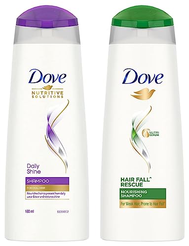 Dove Daily Shine Shampoo 180 mlThe mystery of how to get shiny hair isn't a tricky one to solve. The key to getting shiny damage free hair we all long for is making sure your hair is nourished from the start of your routine. That's where Dove Daily Shine Shampoo comes in. Dove Daily Shine Shampoo with Nutritive Serum builds a protective shield around the hair fiber and defends your hair from daily hair damage. It is a gentle hair cleanser that keeps your hair looking healthy and lustrous. It is mild on your scalp but gives protection from the aggression your hair faces every day. Its Nutritive Serum absorbs into the hair strands to keep them beautifully nourished and shiny this Dove shampoo surrounds your hair with a protective shield defending it from everyday stresses like brushing & damage. And not only is it gentle enough to use every day over time Dove Daily Shine Shampoo makes your hair better*. So as well as cleansing from roots up it helps make your hair look healthy too. The result? Beautifully shiny strong and silky hair which is everything you want it to be. *Based on lab test with Dove Daily Shine System vs non-conditioning shampooDove Hair fall Rescue Shampoo 180 mlWe love the feeling of beautiful hair â but daily hair damage can leave your hair prone to breakage. Let hair fall* be an issue of the past! Use the Hair Fall* Rescue Shampoo from Dove regularly to get thick and luscious looking hair as the Dove shampoo works to reduce hair fall by up to 98%*. Specially formulated for better hair fall* control Dove Nutritive Solutions Hair Fall* Rescue Shampoo strengthens and nourishes fragile hair from roots up. Perfect as a daily hair fall* solution this unique formula fortifies strands to reduce hair fall*. Enriched with Nutrilock Actives our best shampoo for hair fall* immediately helps seal cuticles and strengthens strands to help minimize hair fall due to breakages leaving them looking fuller**. Healthier looking hair means lesser breakage and reduced hair fall*! Buy Dove Hair Fall Rescue Shampoo and forget your hair fall* troubles. Leaves your hair feeling strong and beautiful day after day. Say no to hair fall* worries and do more in life. Dove Hair Fall* Rescue lets you be stronger bolder and closer every day.*Hair fall refers to hair breakage**Hairfall due to breakage Based on a lab test with Dove Hair Fall Rescue System vs non-conditioning shampoo.
