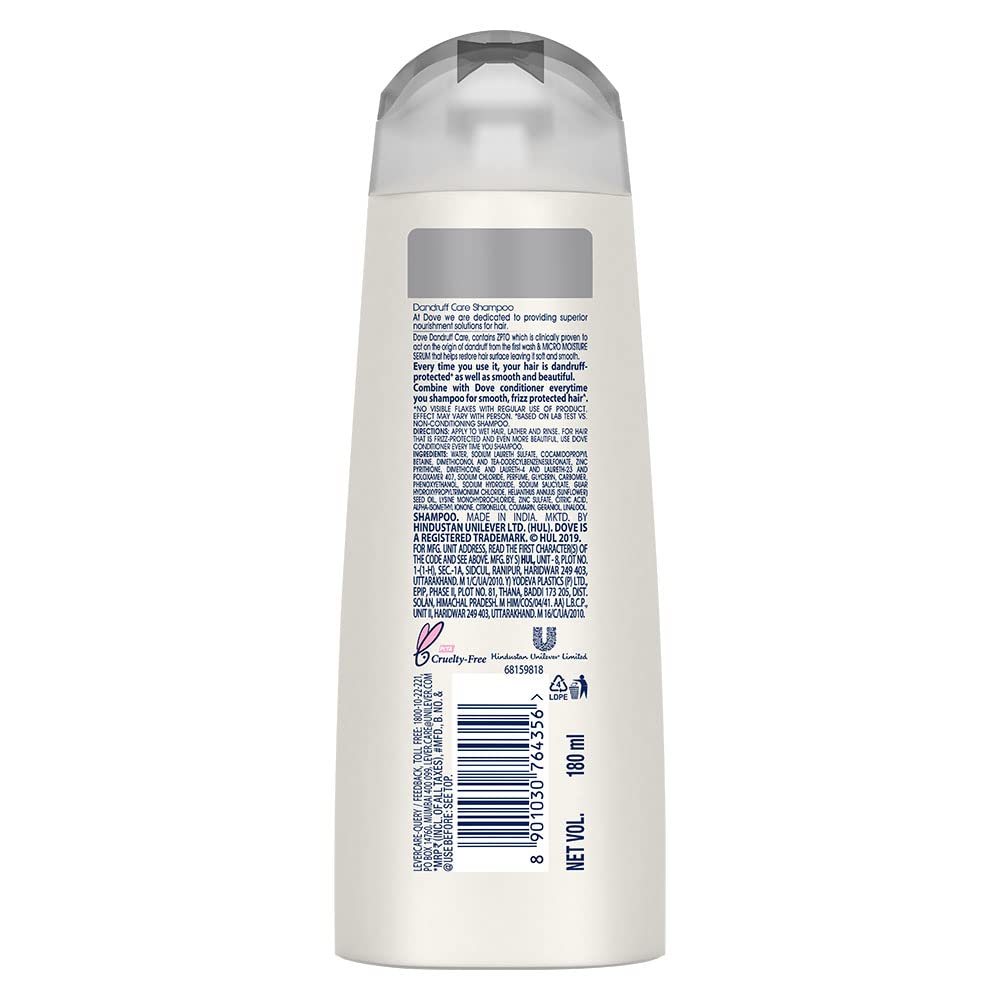 Dove Dandruff Care Shampoo 180 mlAt Dove we are dedicated to providing superior nourishment solutions for hair. The Dove Anti-Dandruff solutions range has been specially designed to give your hair the superior care it needs. It has been carefully created to be clinically effective against dandruff while still being gentle on your hair so that you can use it every day. Worried that dandruff is also leaving your hair dry and rough? When white flakes appear we want to clear them out but also solve for the dryness and roughness of hair. Now say 'bye' to dandruff flakes as well as the dry & rough hair with Doveâs Dandruff Care shampoo. It removes dandruff from your scalp without leaving your hair dry & rough. Dove Dandruff Care shampoo nourishes your hair from roots up giving you hair thatâs 100% smoother* and up to 100% free of dandruff**. Its ZPTO formula is clinically proven to target dandruff at its source and start clearing flakes from the first wash itself. And the Micro Moisture Serum effectively moisturizes hair and leaves them smoother*. For best results use Dove Dandruff Care shampoo along with Dove Dandruff Care conditioner together. No visible flakes with regular product use effect may vary with person.Dove Hair fall Rescue Shampoo 180 mlWe love the feeling of beautiful hair â but daily hair damage can leave your hair prone to breakage. Let hair fall* be an issue of the past! Use the Hair Fall* Rescue Shampoo from Dove regularly to get thick and luscious looking hair as the Dove shampoo works to reduce hair fall by up to 98%*. Specially formulated for better hair fall* control Dove Nutritive Solutions Hair Fall* Rescue Shampoo strengthens and nourishes fragile hair from roots up. Perfect as a daily hair fall* solution this unique formula fortifies strands to reduce hair fall*. Enriched with Nutrilock Actives our best shampoo for hair fall* immediately helps seal cuticles and strengthens strands to help minimize hair fall due to breakages leaving them looking fuller**. Healthier looking hair means lesser breakage and reduced hair fall*! Buy Dove Hair Fall Rescue Shampoo and forget your hair fall* troubles. Leaves your hair feeling strong and beautiful day after day. Say no to hair fall* worries and do more in life. Dove Hair Fall* Rescue lets you be stronger bolder and closer every day.*Hair fall refers to hair breakage**Hairfall due to breakage Based on a lab test with Dove Hair Fall Rescue System vs non-conditioning shampoo.