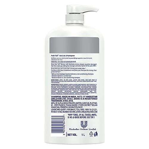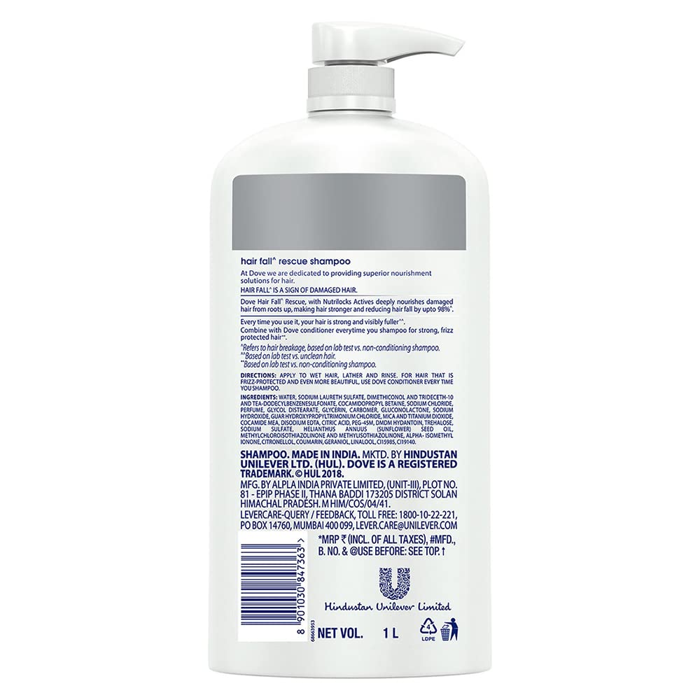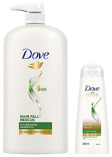 Dove Hair Fall Rescue Shampoo For Weak Hair 1 LtrWe love the feeling of beautiful hair â but daily hair damage can leave your hair prone to breakage. Let hair fall* be an issue of the past! Use the Hair Fall* Rescue Shampoo from Dove regularly to get thick and luscious looking hair as the Dove shampoo works to reduce hair fall by up to 98%*. Specially formulated for better hair fall* control Dove Nutritive Solutions Hair Fall* Rescue Shampoo strengthens and nourishes fragile hair from roots up. Perfect as a daily hair fall* solution this unique formula fortifies strands to reduce hair fall*. Enriched with Nutrilock Actives our best shampoo for hair fall* immediately helps seal cuticles and strengthens strands to help minimize hair fall due to breakages leaving them looking fuller**. Healthier looking hair means lesser breakage and reduced hair fall*! Buy Dove Hair Fall Rescue Shampoo and forget your hair fall* troubles. Leaves your hair feeling strong and beautiful day after day. Say no to hair fall* worries and do more in life. Dove Hair Fall* Rescue lets you be stronger bolder and closer every day.*Hair fall refers to hair breakage**Hairfall due to breakage Based on a lab test with Dove Hair Fall Rescue System vs non-conditioning shampoo Dove Hair Fall Rescue Conditioner 335 ml Hair Fall Control for Smooth Frizz Free Hair - Deep Conditions Dry and Damaged Hair for Men & WomenLooking for a hair fall* solution that leaves you with beautifully strong hair? Tired of frizz that leaves your hair looking unmanageable and dry? Look no further. Everyday damage can stress strands leaving them prone to breakage. Specially created to prevent hair fall* Dove Nutritive Solutions Hair Fall Rescue Conditioner deeply nourishes fragile hair from roots up for better hair fall* control. Fortify hair fibers with every wash. Enriched with Nutrilock Actives the nourishing formula immediately seals cuticles and strengthens your hair to minimize breakage. Buy Dove Hair Fall Rescue Conditioner here and watch your hair love itself! Caring for your hair from the roots up Dove Hair Fall Rescue Conditioner protects against hair fall* by strengthening the strands against breakage. Formulated with Nutrilock actives it leaves hair strong and healthy-looking after each wash helping prevent further hair fall*. It also reduces frizz making hair appear smooth and free of fly away hair. This system is designed for strengthening your strands and making your hair better. Now for reduced hairfall worries dove ** Buy the New Dove Hair Fall Rescue conditioner! *Hair fall refers to hair breakage**Based on a lab test with Dove Hair Fall Rescue System vs non-conditioning shampoo