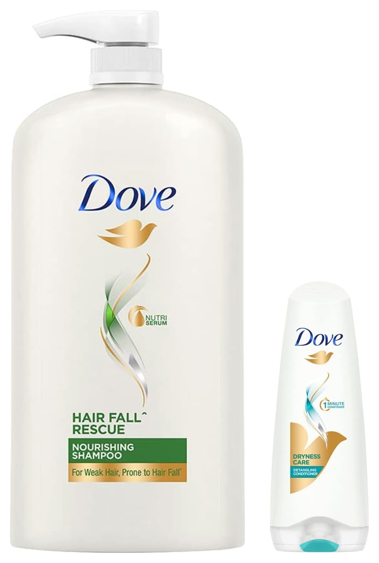 Dove Hair Fall Rescue Shampoo 1LWe love the feeling of beautiful hair â but daily damage can leave your hair prone to breakage. Let hair fall be an issue of the past. Use the hair fall rescue shampoo from Dove regularly to get thick and luscious hair as the shampoo works to reduce hair fall by up to 98 percent . Specially formulated for better hair fall control Dove nutritive solutions hair fall rescue shampoo strengthens and nourishes fragile hair from roots up. Perfect as a daily hair fall treatment the gentle formula fortifies strands to reduce hair fall . Enriched with nutrilock actives our best shampoo for hair fall immediately seals cuticles and strengthens strands to help minimize hair fall due to breakages leaving them looking fuller. Healthier hair means lesser breakage and reduced hair fall . Buy Dove hair fall rescue shampoo and forget your hair fall troubles. Leaving your hair feeling strong and beautiful day after day. Say no to hair fall worries and do more in life. Dove hair fall rescue lets you be stronger bolder and closer every day. Hair fall refers to hair breakage based on a lab test with Dove hair fall rescue system vs non-conditioning shampoo.Dove Dryness Care Conditioner 180mlStay away from dry hair with Dove dryness care conditioner. Enriched with pro-moisture complex formula your hair will look bouncy and silky from roots up. All sorts of things from daily grooming to being out in the sun can leave your hair feeling a touch dry but a conditioner for dry hair can help protect your hair from everyday wear and tear and make it feel soft and smooth. That's why we've developed Dove dryness care conditioner: to help give you the silky hair that you love every day. Protect your hair from daily wear and tear with Dove nutritive solutions dryness care moisturizing conditioner. Formulated with pro-moisture complex its nourishing formula for silky hair leaves locks soft. Suitable for daily use this moisturizing conditioner gently cleanses hair for manageable strands that arenât weighed down. With every use of this Dove conditioner youâll be left with smooth soft and more manageable hair. This Dove conditioner helps to immediately smooth strands while deeply nourishing hair for healthier looking locks. With every wash it detangles and improves manageability for the appearance of soft and silky hair. Strength against hair breakage based on lab test with Dove dryness care system vs. Non-conditioning shampoo.