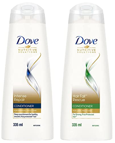 Dove Intense Repair Conditioner 335 ml With Keratin Actives to Smoothen Dry and Frizzy Hair - Deep Conditions Damaged Hair for Men & WomenDoes your hair get frizzy and unmanageable? Are you left wishing for a remedy to fix your frizzy tassels? Do you want to know the secret to fixing frizzy hair? Try New Dove Intense Repair Conditioner. Control frizz with a nourishing conditioner thatâs formulated to nourish and help with frizz prevention. Formulated with Keratin Actives Dove Intense Repair Conditioner helps to nourish dry and frizzy hair with two-way care. It controls external signs of dryness in the form of frizz while nourishing strands to help them look their best. This conditioner for frizzy damaged hair leaves hair visibly smooth and more manageable â giving you smoother hair* that you will be proud of. Use it after your shampoo on damp hair for best results. This nourishing conditioner works immediately to smoothen the hair surface deeply nourishing to moisturize hair strands for healthier looking and smoother*hair use Dove repair conditioner. With every use youâll be left with shiny and beautiful hair. Buy New Dove Intense Repair conditioner and treat your hair to a look that will be the cause of envy among all your friends. Dove Conditioners for 100% care. *Based on lab test with Dove Intense Repair system vs non-conditioning shampooDove Hair Fall Rescue Conditioner 335 ml Hair Fall Control for Smooth Frizz Free Hair - Deep Conditions Dry and Damaged Hair for Men & WomenLooking for a hair fall* solution that leaves you with beautifully strong hair? Tired of frizz that leaves your hair looking unmanageable and dry? Look no further. Everyday damage can stress strands leaving them prone to breakage. Specially created to prevent hair fall* Dove Nutritive Solutions Hair Fall Rescue Conditioner deeply nourishes fragile hair from roots up for better hair fall* control. Fortify hair fibers with every wash. Enriched with Nutrilock Actives the nourishing formula immediately seals cuticles and strengthens your hair to minimize breakage. Buy Dove Hair Fall Rescue Conditioner here and watch your hair love itself! Caring for your hair from the roots up Dove Hair Fall Rescue Conditioner protects against hair fall* by strengthening the strands against breakage. Formulated with Nutrilock actives it leaves hair strong and healthy-looking after each wash helping prevent further hair fall*. It also reduces frizz making hair appear smooth and free of fly away hair. This system is designed for strengthening your strands and making your hair better. Now for reduced hairfall worries dove ** Buy the New Dove Hair Fall Rescue conditioner! *Hair fall refers to hair breakage**Based on a lab test with Dove Hair Fall Rescue System vs non-conditioning shampoo