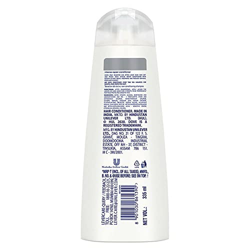 Dove Intense Repair Hair Conditioner 340 ml With Keratin Actives to Smoothen Dry and Frizzy Hair - Deep Conditioner for Damaged Hair for Men & WomenDoes your hair get frizzy and unmanageable? Are you left wishing for a remedy to fix your frizzy tassels? Do you want to know the secret to fixing frizzy hair? Try New Dove Intense Repair Conditioner. Control frizz with a nourishing conditioner thatâs formulated to nourish and help with frizz prevention. Formulated with Keratin Actives Dove Intense Repair Conditioner helps to nourish dry and frizzy hair with two-way care. It controls external signs of dryness in the form of frizz while nourishing strands to help them look their best. This conditioner for frizzy damaged hair leaves hair visibly smooth and more manageable â giving you smoother hair* that you will be proud of. Use it after your shampoo on damp hair for best results. This nourishing conditioner works immediately to smoothen the hair surface deeply nourishing to moisturize hair strands for healthier looking and smoother*hair use Dove repair conditioner. With every use youâll be left with shiny and beautiful hair. Buy New Dove Intense Repair conditioner and treat your hair to a look that will be the cause of envy among all your friends. Dove Conditioners for 100% care. *Based on lab test with Dove Intense Repair system vs non-conditioning shampooDove Intense Repair Shampoo 340 ml Repairs Dry and Damaged Hair Strengthening Shampoo for Smooth & Strong Hair - Mild Daily Shampoo for Men & WomenIs your hair showing signs of damage â split ends dryness roughness or hair fall. The secret of how to repair damaged hair. A strengthening shampoo that helps to treat the signs of damage with two-way care for both long and short-term results . Give your hair the essential care it deserves with Dove intense repair shampoo. The intense repair shampoo works to restore the health and shine of your hair. It contains fibre actives which penetrate your hair and rebuild damaged hair to renew the lost gloss and vigour and give life to your damaged hair. Gentle enough for daily use Dove intense repair shampoo helps to immediately repair strands while nourishing them from within for healthy looking hair thatâs stronger this shampoo for damaged hair repairs signs of damage for smooth and strong hair. Formulated with fibre actives this shampoo for damaged hair reinforces strands to prevent the signs of damage on hair. Nourishment for damaged hair to leave you with beautiful looking hair all day long. Based on lab test with Dove intense repair system vs non-conditioning shampoo strength against hair breakage based on lab test with Dove intense repair system vs. Non-conditioning shampoo. How to use :Completely soak your hair and massage your shampoo gently over your scalp. Rinse it out well. Usually rinse and repeat? For daily shampooing the rinse and repeat rule isn't actually necessary (unless you've been trigger-happy with the hairspray) so just once will do. Try this : To keep that damage repair going make sure you use a conditioner that works with your shampoo too. Our Intensive Repair Conditioner will help to prevent breakages and leave your hair looking and feeling instantly nourished and beautiful. Ingredients : Ingredients Water Sodium Laureth Sulfate Dimethiconol and Trideceth-10 and TEA-Dodecylbenzenesulfonate Glycol Distearate Cocamidopropyl Betaine Sodium Chloride Perfume Glycerin Cocamide MEA Amodimethicone and Cetrimonium Chloride and Trideceth-12 Guar Hydroxypropyltrimonium Chloride Acrylates/Beheneth-25 Methacrylate Copolymer Styrene/Acrylates Copolymer Mica and Titanium Dioxide Sodium Hydroxide Disodium EDTA Gluconolactone Trehalose Adipic Acid Sodium Sulfate PEG-45M DMDM Hydantoin Helianthus Annuus (Sunflower) Seed Oil Methylchloroisothiazolinone and Methylisothiazolinone Alpha-Isomethyl Ionone Citronellol Geraniol Linalool.