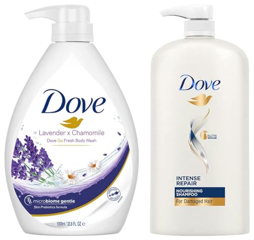 Dove Lavender & Chamomile Go Fresh Body Wash Pump Bottle 1L & Dove Intense Repair Shampoo 1 L, Repairs Dry and Damaged Hair, Strengthening Shampoo