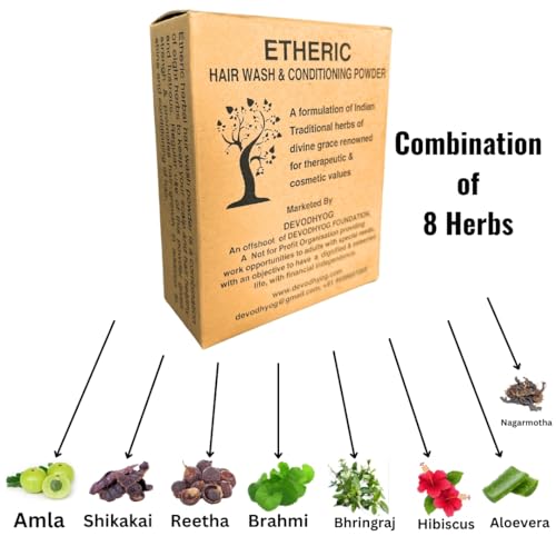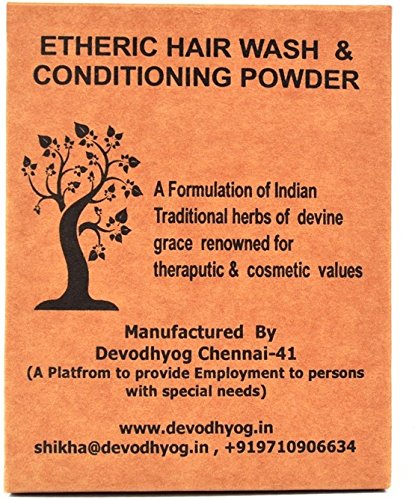 Devodhyog was founded with a mission to spread across the world the brilliance of Indian Traditional therapeutic herbs over modern cosmetics. We manufactures beauty and personal care products under Etheric Brand which are known for their quality purity truthiness and promise made.Etheric hair wash & conditioning Powder contains -Shikakai (Acacia Concinna) Aritha ( Sapindus Trifoliatu) Amla (Emblica Officinalis ) Bra. mhi (Bacopa Monnieri) Bhringraj (Eclipta Alba) Hibiscus (Rosa Sinensis ) Kapur Kachri (Hedichium spicatium) Nagarmotha (Cyperus Scariosus). Regular use of this gives strengthen hair promotes hair growth & make hair shiny with conditioning .In addition regular use provides a permanent solution against dandruff.