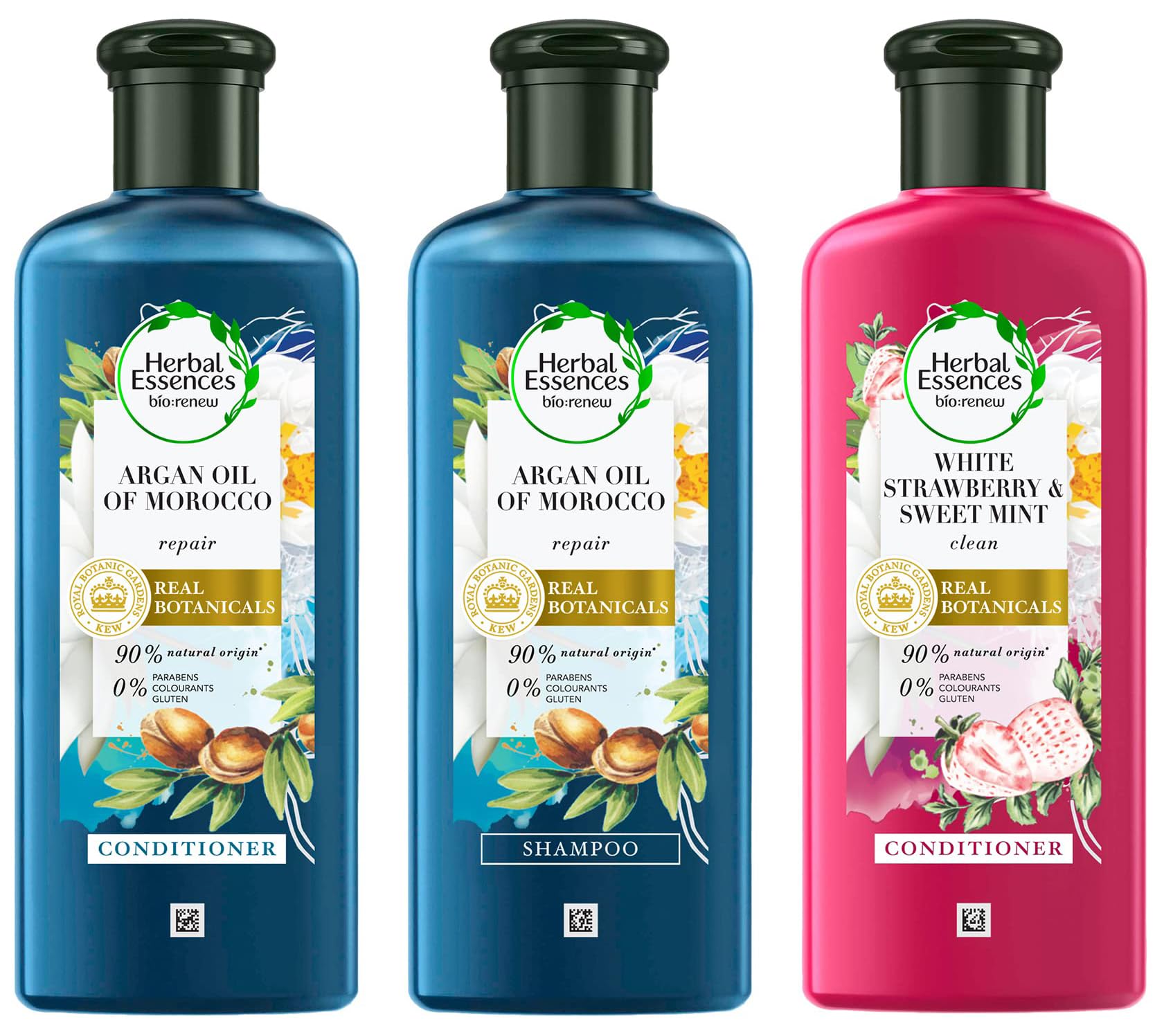 Herbal Essences White Strawberry & Sweet Mint CONDITIONER- For Cleansing and Volume - No Paraben No Colorants 240 MLGently condition hair with Herbal Essences bio:renew WHITE STRAWBERRY & SWEET MINT CONDITIONER to leave it voluminous and vibrant. Crafted with bio:renew our signature blend of essential antioxidants aloe and sea kelp WHITE STRAWBERRY & SWEET MINT CONDITIONER also helps purify and protect against impurities to bring your hair back to life. Free of parabens gluten and colorants WHITE STRAWBERRY & SWEET MINT CONDITIONER gently conditions as it infuses crisp notes of white strawberry delicate jasmine and invigorating mint into your hair.Herbal Essences Moroccan Argan oil Shampoo for Frizz Free Soft Hair. With Argan Oil for Hair. Paraben Free240mlRepair damaged hair with Herbal Essences bio:renew ARGAN OIL OF MOROCCO SHAMPOO to leave it smoother and softer with every wash.Crafted with bio:renew our signature blend of essential antioxidants aloe and sea kelp ARGAN OIL OF MOROCCO SHAMPOO will leave your hair shining brighter feeling repaired and having freedom from frizz to bring it back to life in just 21 days. Free of parabens gluten and colorants from the first pop of the cap it will take you on a multi-layered scent experience to the warm sands of Morocco. Immerse yourself in the scent of creamy vanilla followed by a burst of fizzy citrus and lingering exotic spices.Herbal Essences Argan Oil of Morocco CONDITIONER- For Hair Repair and No Frizz- No Paraben No Colorants 240 MLRepair damaged hair with Herbal Essences bio:renew ARGAN OIL OF MOROCCO CONDITIONER to leave it smoother and softer.Crafted with bio:renew our signature blend of essential antioxidants aloe and sea kelp ARGAN OIL OF MOROCCO CONDITIONER will leave your hair shining brighter feeling repaired and having freedom from frizz to bring it back to life in just 21 days. Free of parabens gluten and colorants from the first pop of the cap it will take you on a multi-layered scent experience to the warm sands of Morocco. Immerse yourself in the scent of creamy vanilla followed by a burst of fizzy citrus and lingering exotic spices. Usage Instructions: Apply generously to wet hair from root to tip & rinse.