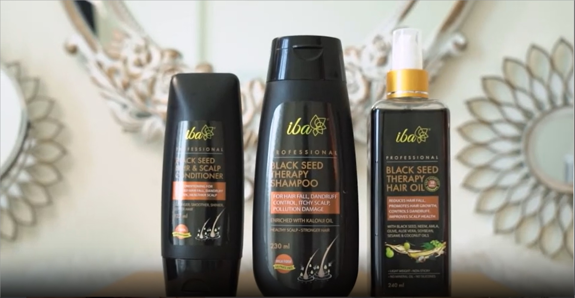 Iba Black Seed Therapy Shampoo Conditioner Hair oil Combo (230 ml + 125 ml + 240 ml) l Kalonji For Hair Fall Dandruff Itchy Scalp | No Sulfate No ParabenA 3-step complete professional hair care regimen to effectively deep cleanse reduce hair fall control dandruff soothe itchy scalp and nourish roots.Iba Professional Black Seed Therapy ShampooHelps manage hair fall with vitamin-rich Black Seed (Kalonji) OilHelps to control dandruff and excess sebum with anti-bacterial anti-fungal agents like Neem Extract Zinc Pyrithione (Zpto)Supports stronger thicker hair due to the benefits of phyto-nutrient-rich Gooseberry (Amla) Extract.High foaming sulfate-free formula helps lock colour and addresses greyingIba Professional Black Seed Therapy ConditionerConsistent use leads to flexible and stronger hair while helping to reduce breakage and split ends by helping the absorption of vital proteinsHair becomes smoother softer shinier frizz-free and more manageable than before.Iba Professional Black Seed Therapy Hair OilBlack Seed (Kalonji) Oil: Rich in thymoquinone antioxidants vitamins and minerals it contributes to nourishment and strength of hair roots to help prevent hair fall and to promote regrowthAmla Oil: With Vitamin C flavonoids and polyphenols to strengthen and condition follicles to add lustreAloe Vera Oil Neem Oil: With antiseptic properties they soothe the scalpSoybean Seed Oil Coconut Oil: With lipids that improve moisture retention and shineOlive Oil: Helps to repair hair damage due to sun chemicals and styling toolsSesame Seed Oil: Moisturizes scalp to prevent dryness and frizziness and also addresses premature greying of hair
