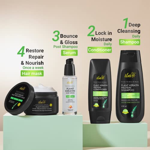 Iba Professional Plant Keratin Protein Combo | Shampoo 230ml Conditioner 125ml Mask 200ml Serum 45ml | For Dry Frizzy Damaged Hair Transparent and Long Lasting | No Sulfates No ParabensGet Salon-Like Smooth Frizz-Free & Silky Hair at home!Iba Professional Plant Keratin Protein Shampoo Helps rebuild damaged hair structure by replenishing vital proteins Creates a protective layer that works to prevent structural damage and assists smoothening of cuticles to retain color and moisture Contributes to reduction of frizz acts to seal and repair split-ends making hair more manageable than before Effectively cleanses hair and scalp with high foaming sulfate-free formulaIba Professional Plant Keratin Protein Conditioner Helps to revitalize hair structure with better absorption and anchoring of vital proteins Supports more flexible & stronger hair while helping to reduce breakage and split-ends Forms a protective coating to lock moisture and color allowing hair to become smoother softer shiner frizz-free and more manageable than before.Iba Professional Plant Keratin Hair Treatment Mask Infused with Plant Keratin Protein Hyaluronic Acid Shea Butter & Argan Oil to intensely nourish dry hair and infuse moisture Repairs damage and closes cuticles to prevent loss of nutrition and moisture Smoothens the hair surface and improves combability Adds intensive shine Shields hair from chemical treatment and hair styling equipment led damage leaving it looking smoother and silkier Controls frizz and tames fly-awaysIba Professional Plant Keratin Next Gen Hair Serum Contains advanced actives such as Plant Keratin Argan Oil & UV Filters that cover the hair in a light film making them smooth & manageable without weighing them down Smoothens hair and adds high gloss Conditions hair making them soft and frizz-free