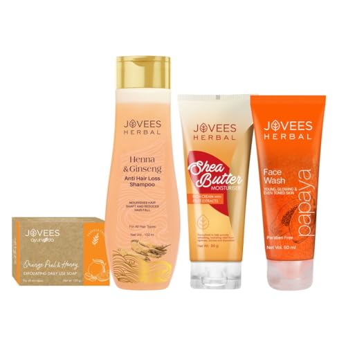 Jovees Herbal Orange Peel Soap (100g) + Henna & Ginseng Anti Hair Loss Shampoo (150ml) + Shea butter Moisturiser (50g) + Papaya Face wash (50ml) Set Of 4