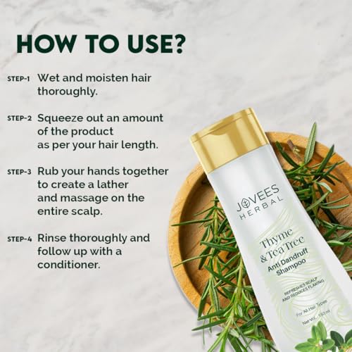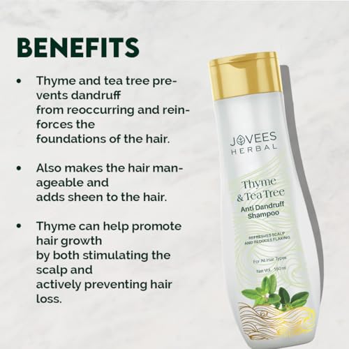 • CLINICALLY TESTED: Infused with premium quality natural ingredients like Tea Tree Extract Thyme Extract Rosemary Oil and Lemon Extract Jovees Thyme and Tea Tree Anti Dandruff shampoo is clinically tested and is paraben alcohol and cruelty free making it s