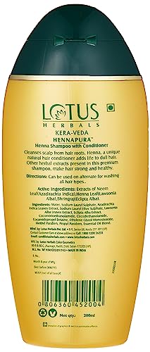 Shampoo with Conditioner - Details: Lotus Herbals Kera-Veda Hennapura cleanses scalp from hair root. Henna a unique natural hair conditioner adds life to dull hair. Other herbal extracts present in this premium shampoo make hair strong and healthy.