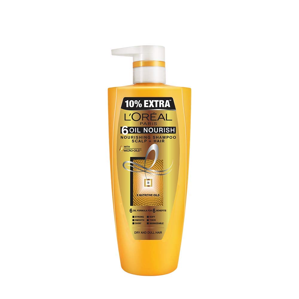L'Oreal Paris 6 Oil Nourish Shampoo 360ml (With 10% Extra)L'Oreal Paris 6 Oil Nourish Shampoo has been created to provide complete nourishment to your hair from root to tip with six micro oils™ making it soft shiny thick strong smooth and manageable. Pamper your hair with the 6-Oil Nourish Shampoo personalized for your hair type. Science meets tradition with the infusion of 6 unique oils - Argan Almond Jojoba Olive Coconut and Camelina. Penetrates deep into the scalp giving it utmost nourishment and care that is suitable for all hair types. L'Oreal Paris helps to revive all forms of hair damage. Whether it’s from heat styling color processing or dryness L'Oreal Paris has powerful treatments formulated with superior technology.L'Oreal Paris 6 Oil Nourish Shampoo 640ml (With 10% Extra)L'Oreal Paris 6 Oil Nourish Shampoo has been created to provide complete nourishment to your hair from root to tip with six micro oils™ making it soft shiny thick strong smooth and manageable. Pamper your hair with the 6-Oil Nourish Shampoo personalized for your hair type. Science meets tradition with the infusion of 6 unique oils - Argan Almond Jojoba Olive Coconut and Camelina. Penetrates deep into the scalp giving it utmost nourishment and care that is suitable for all hair types. L'Oreal Paris helps to revive all forms of hair damage. Whether it’s from heat styling color processing or dryness L'Oreal Paris has powerful treatments formulated with superior technology.