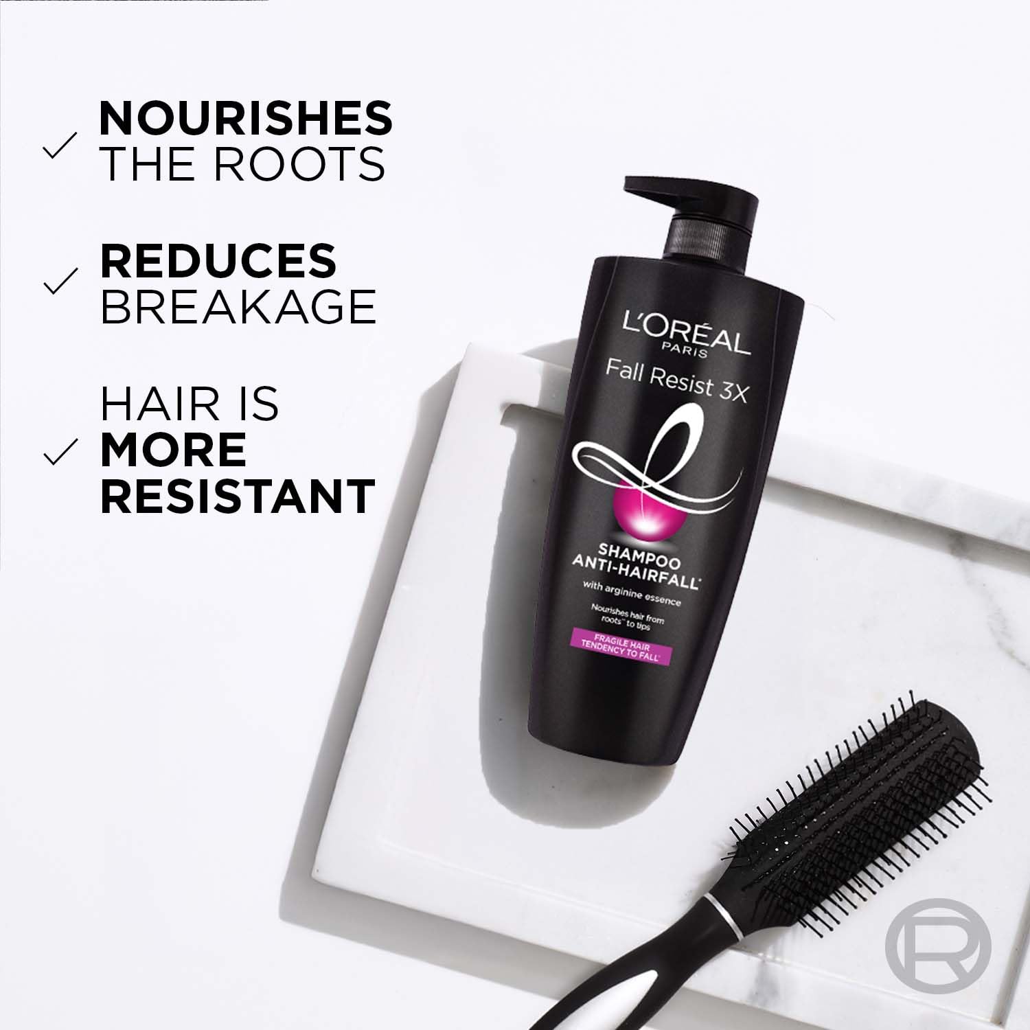 Strengthen every strand! Resist hair fall with L'Or©al Paris Expertise Fall Resist 3X Anti-Hair Fall shampoo. Enriched with Arginine Essence and Salicylic Acid; weakened and falling hair is left restructured stronger and more resilient to damaging external aggressors. Hair follicles are filled and cuticles are nourished and repaired leaving locks looking luscious from root to tip.