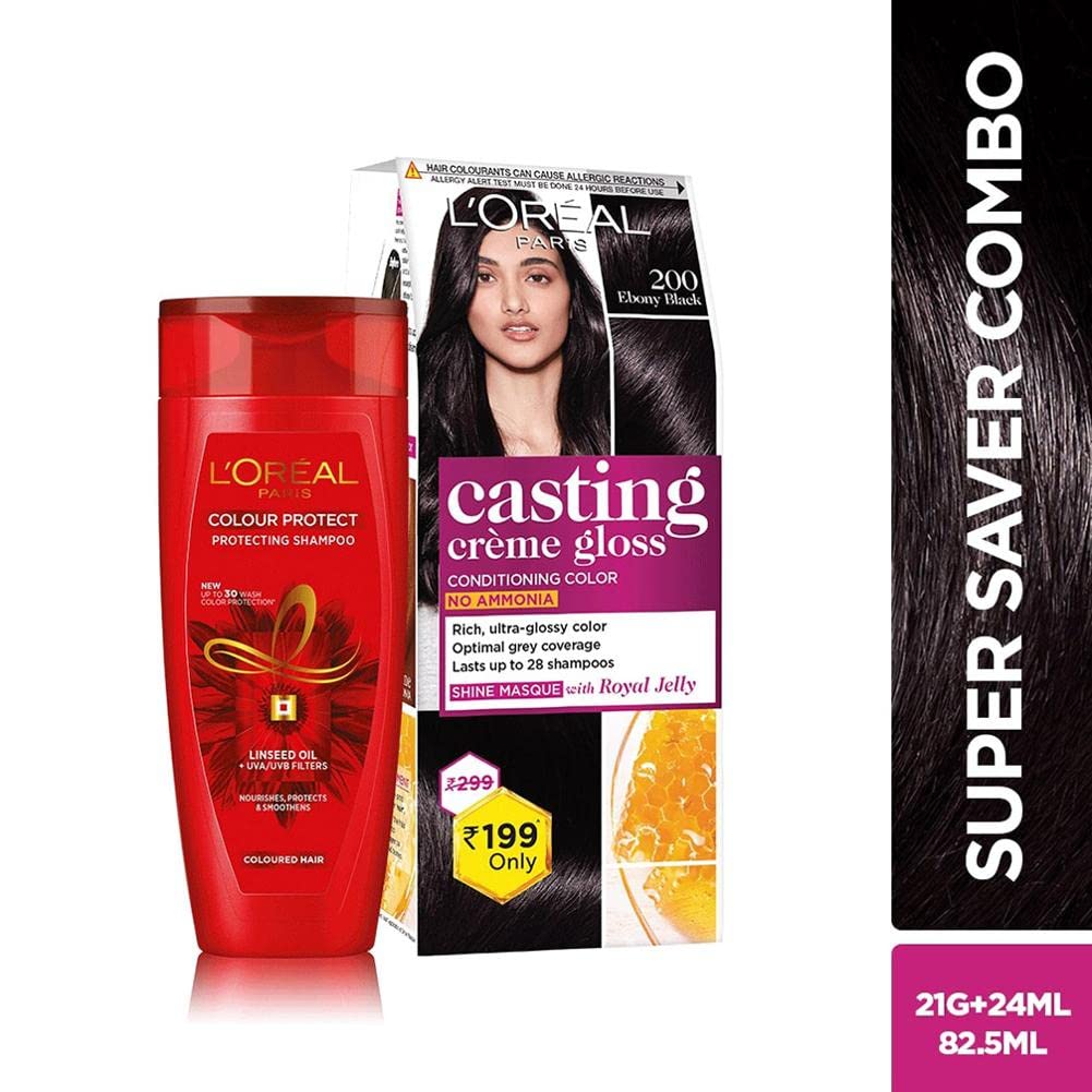 Buy this exciting combo pack! Casting me gLose is an ammonia-free hair colour that gives your hair visible shimmering tones gLosey shine and covers greys. It gives you the richness of natural hair colour that lasts up to 28 shampoos. Casting me gLose super-nourishing formula of caring conditioner leaves your hair nourished soft voluptuous. Colour protect shampoo by L'Oreal Paris nourishes the hair and transforms its surface keeping the hair protected and prolonging the colour radiance. The colour protect formula with UV filter- light reflecting system combines an active nourishing ingredient and filters for colour treated hair.