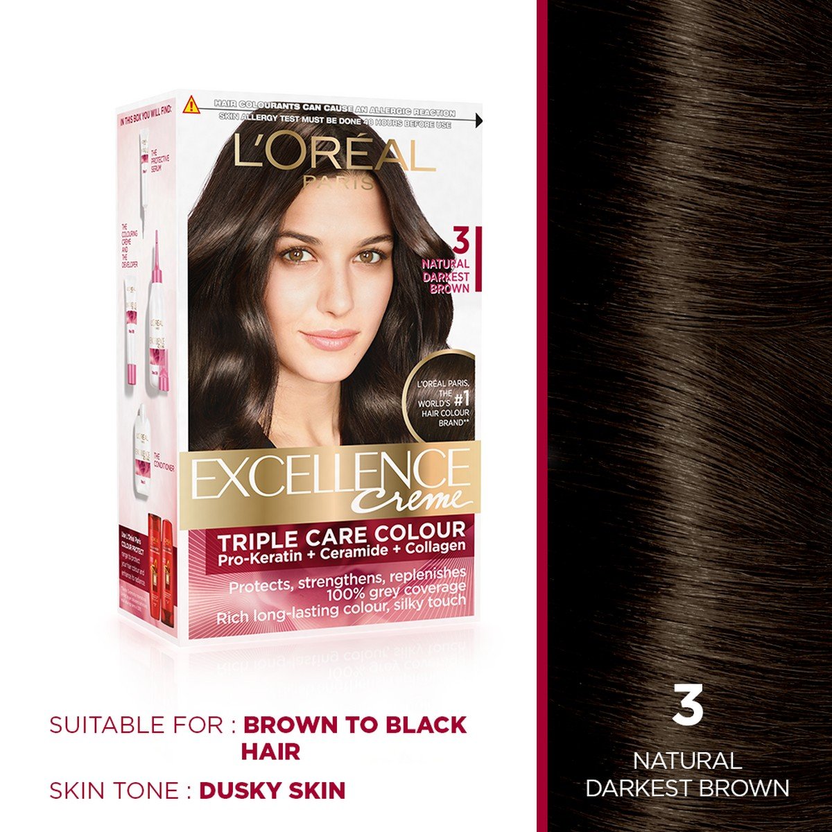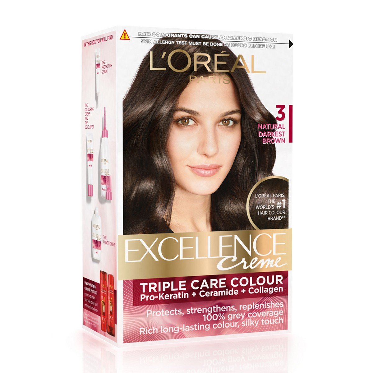 L'Oreal Paris Excellence Creme Hair Color 3 Natural Darkest Brown 72ml+100gPermanent hair colour that strengthens and revitalises your hair Leaves hair soft and silky Gives you a younger look Provides a rich natural colour with 100% grey coverage from root to tipL'Oreal Paris Color Protect Shampoo 360ml (With 10% Extra)Nourishes the hair and transforms its surface hair feels silky to touchHelps protect the hair fibre from external aggressionHair is portected and colour radiance is visibly prolong