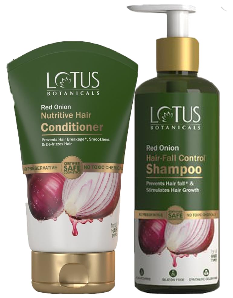 Lotus Botanicals Red Onion Hair Fall Control Shampoo and Hair Conditioner set is a powerful duo to combat hair loss and promote healthy hair growth. The shampoo (300ml) is enriched with red onion seed oil known for its hair-strengthening properties while the conditioner (150g) nourishes and revitalises strands from root to tip. This set gently cleanses the scalp removes impurities and provides essential nutrients to minimise breakage and thinning. Regular use can result in lustrous voluminous tresses with reduced hair fall. Suitable for all hair types this ayurvedic formulation utilises natural ingredients for visible results. Indulge in the invigorating aroma and experience the transformative power of Lotus Botanicals.