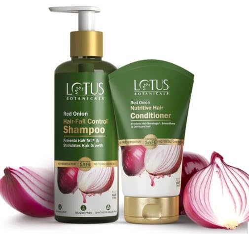 Preserve your precious hair and prevent it from thinning with the Red Onion Hair-fall Control* Shampoo & Red Onion Nutritive Hair Conditioner. Enriched with 100% natural red onion extracts. The result of which is reduced hair loss thick & healthy tresses along with more hair volume. Good to know - Who can Use Red Onion Shampoo & Conditioner Combos Stress a poor diet an active lifestyle and damaging environmental toxins all have an adverse effect on the health of your hair leaving the strands lifeless and weak. You may significantly reduce hair loss and hair damage by making lifestyle changes eating a well-balanced diet and selecting the correct hair care products. Red Onion shampoo and conditioner is no less than a blessing for those who are constantly dealing with dry scalp brittle hair follicles premature hair greying itchy scalp alopecia and dandruff. Lotus Botanicalâs 100% vegan range of Red Onion Nutritive Hair Conditioner and Shampoo works wonders in promoting hair growth and bringing back the lost shine! Why Use Lotus Red Onion Shampoo And Conditioner Combo Red Onion Helps Control Dandruff & Dryness Both Red Onion Shampoo and conditioner are infused with Red Onionâs anti-inflammatory characteristics which aid in preventing dryness dandruff and scalp eruptions. The shampoo and conditioner works wonders on dry hair by providing them with the required hydration. Red Onion Helps Control Hair Fall Lotus Botanicals Red Onion infused shampoo and conditioner helps improve the blood supply to your hair follicles thus preventing hair loss and encouraging new hair growth. Being rich in flavonoids onion extracts destroy free radicals that lead to thinning of hair and hair loss. (1) Red Onion Nourishes Scalp and Locks in Shine While gently massaging and washing your hair with red onion shampoo the antibacterial properties of red onion stimulate your scalp and improve blood circulation. Being rich in potassium and sulphur the red onion hair conditi