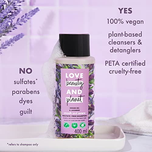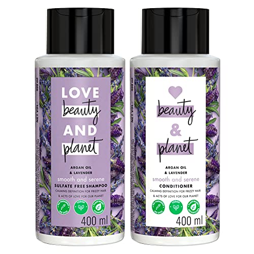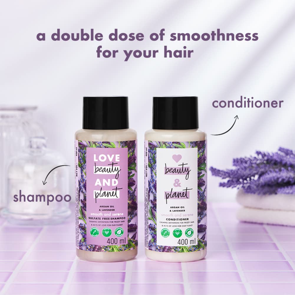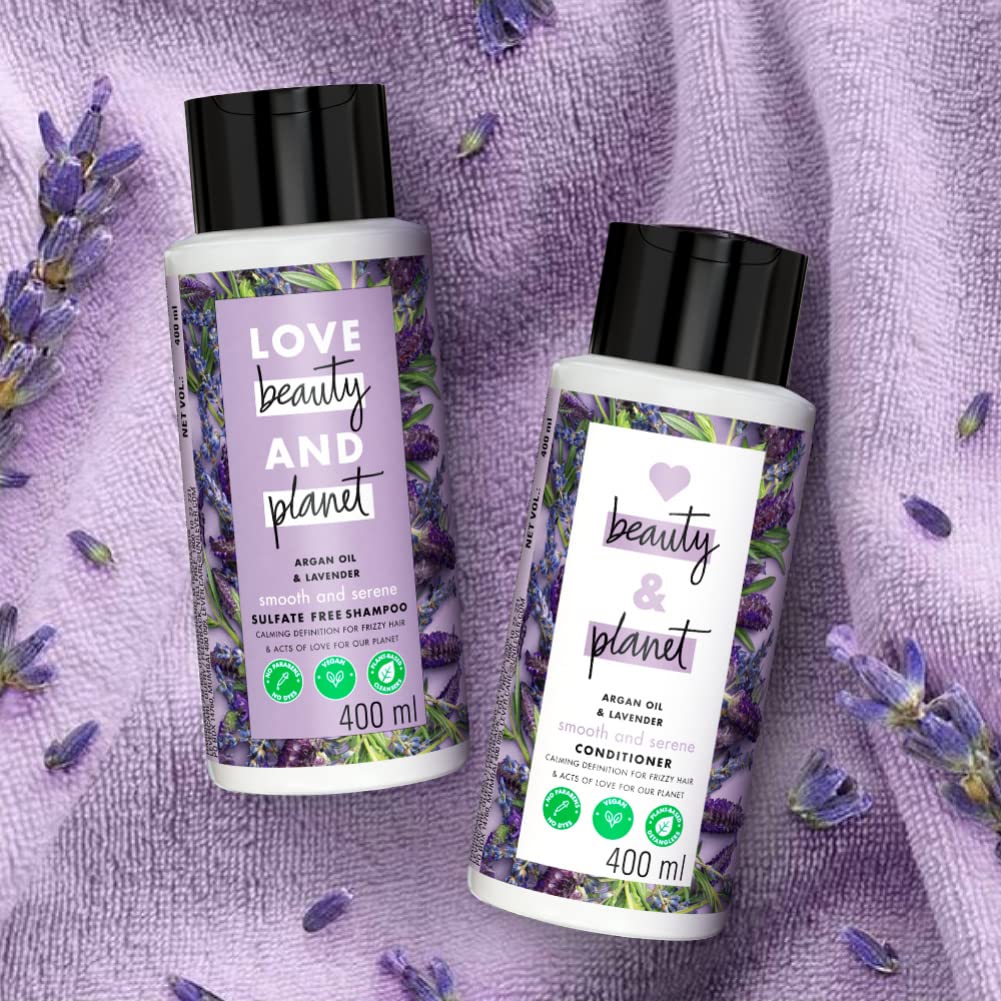 Love Beauty & Planet Smoothening Shampoo With Natural Argan Oil & Lavender For Frizzy Dry & Curly Hair No Parabens No Silicones 400 mlCalm your frizz for hair that's oh so smooth with our smooth and serene shampoo our anti frizz shampoo is made with plant based cleansers and infused with organic coconut oil. Delicately surrounds your hair in a cloud of heirloom french lavender sourced ethically from the drome provencale region of france. Simply squeeze lather and rinse. Go easy on the tap for brilliantly beautiful hair try our line of frizz control hair products follow up with our love beauty and planet argan oil and lavender smooth and serene conditioner. At love beauty and planet we are committed to acts of love that make you and our planet a little more beautiful everyday. Our goal is a carbon footprint so small it's like we weren't even here. We started our journey by loading our beauty products with goodness. Every one of our bottles is made from 100 percent recycled materials and are recyclable. Our caps and pumps aren't made from recycled plastics yet but we're working on it. No silicones no parabens no dyes no guilt. Yes vegan yes peta certified yes coconut oil. We are committed to small acts of love that make you and our planet a little more beautiful everyday.Love Beauty & Planet Natural Argan Oil & Lavender Smoothening Conditioner Relaxes Frizzy Dry & Curly Hair No Parabens No Silicones 400 mlCalm your frizz for hair that's oh so smooth with our smooth and serene conditioner our anti frizz conditioner is made with plant based cleansers and infused with organic coconut oil. Our fast-rinse conditioner technology saves you from tangles and can help you save water. Delicately surround your hair in a cloud of heirloom french lavender sourced ethically from the drome provencale region of france. How to use? After shampooing spread through your gorgeous wet locks. Avoid the roots rinse. Go easy on the tap for brilliantly beautiful hair try our line of frizz control hair products start with our love beauty and planet argan oil and lavender smooth and serene shampoo. At love beauty and planet we are committed to acts of love that make you and our planet a little more beautiful everyday. Our goal is a carbon footprint so small it's like we weren't even here. We started our journey by loading our beauty products with goodness. Every one of our bottles is made from 100 percent recycled materials and are recyclable. Our caps and pumps aren't made from recycled plastics yet but we're working on it. No silicones no parabens. Yes vegan yes peta certified cruelty free.