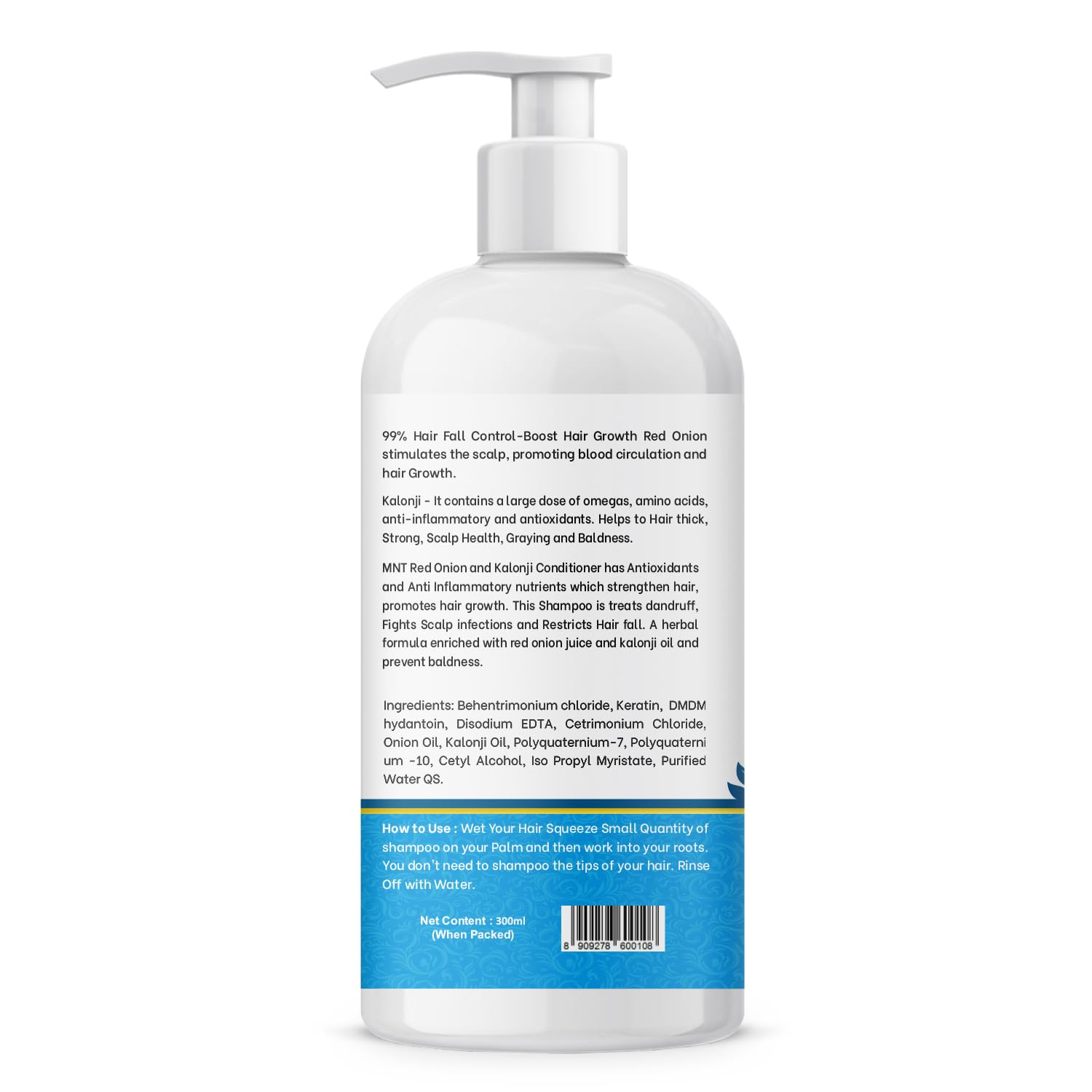 • MNT Red Onion & Kalonji hair conditioner helps to add moisture to hair by depositing ingredients that can help to prevent hair from becoming dry brittle and damaged.