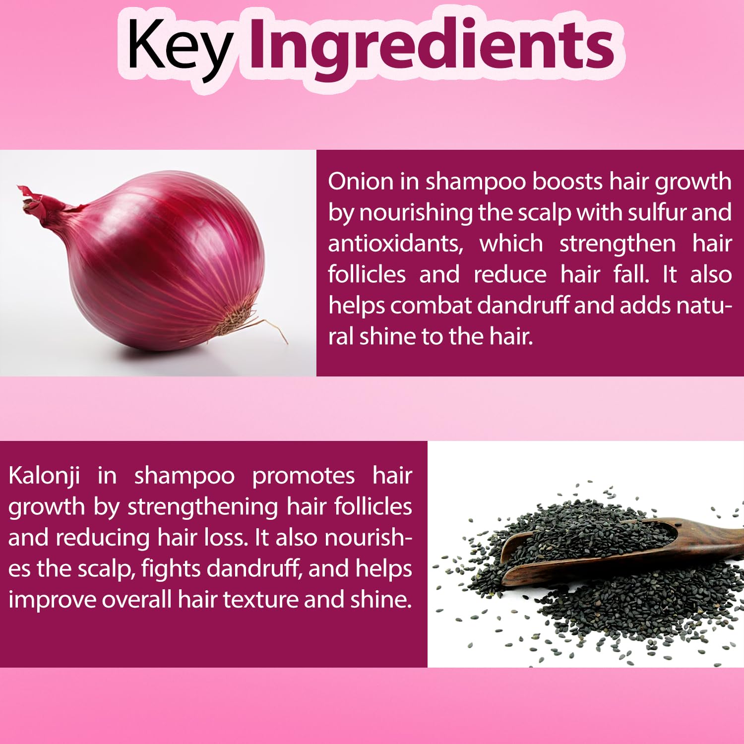 • Onion & Kalonji is rich in sulfur which is a nutrient that is essential for hair growth.