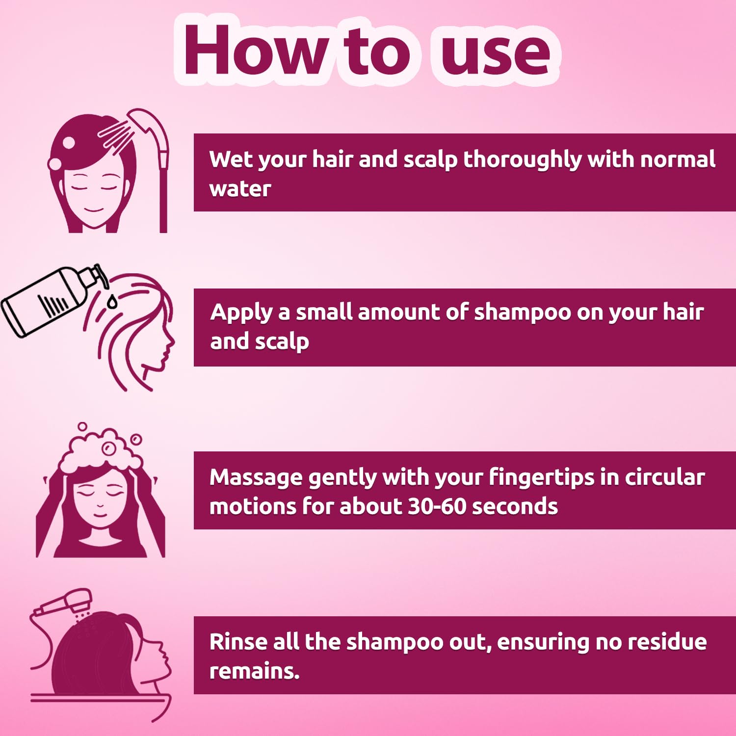 • How to use: Massage the shampoo into your scalp cover all hair with your fingertips and then wash.