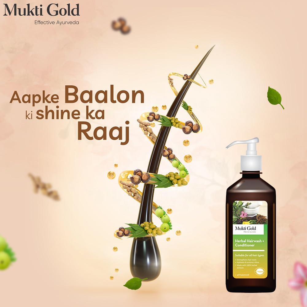 NOURISHING 2-IN-1 FORMULA: Mukti Gold Herbal Hair Wash + Conditioner Combines shampoo and conditioner benefits. Infused with aloe vera Bhringraj and amla extracts it nourishes hair enhancing strength silkiness and shine.