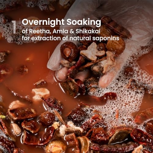 A wholesome 9-Care shampoo made over a 72Hr+ long signature ayurvedic preparation. With reetha shikakai fermented soy sesame decoction of herbs flowers & a mashed mix of fatty seeds & oils it cares for hair in 9 essential ways. It strengthens nourishes & imparts deep shine to tresses while cleansing & balancing scalp health. No dryness or damage. No sulphates no chemicals 100% naturally derived!
