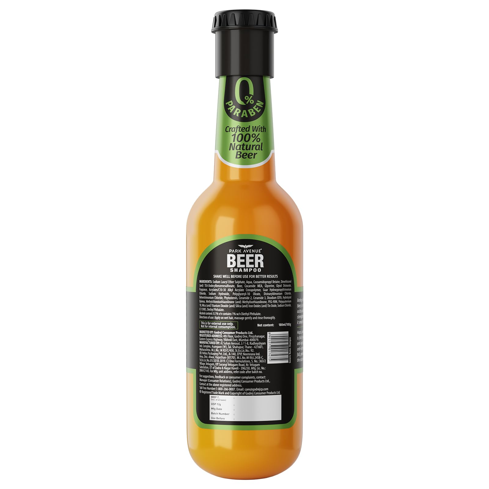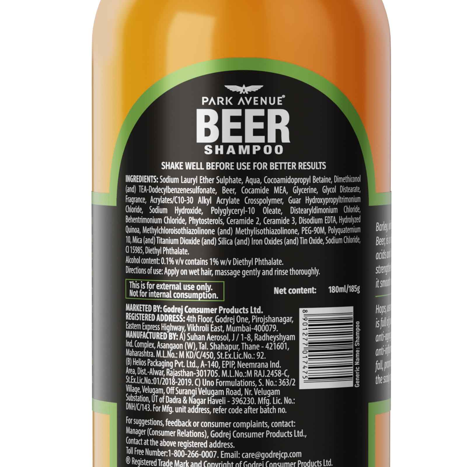 Park Avenue Beer Shampoo 180ml With hops and barley for hair fall control and Beer Shampoo 180ml Paraben-free shampoo for dull lifeless hair adds shine and bounce.
