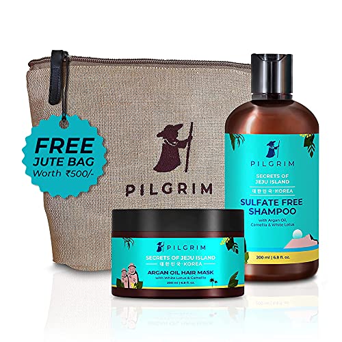 PILGRIM Korean Healthy & Shiny Hair Care Kit With Jute Kit Bag | Sulphate Free Shampoo 200ml & Argan Oil Hair Mask 200gm For Gentle Cleansing, Frizz Control, Moisture & Shine