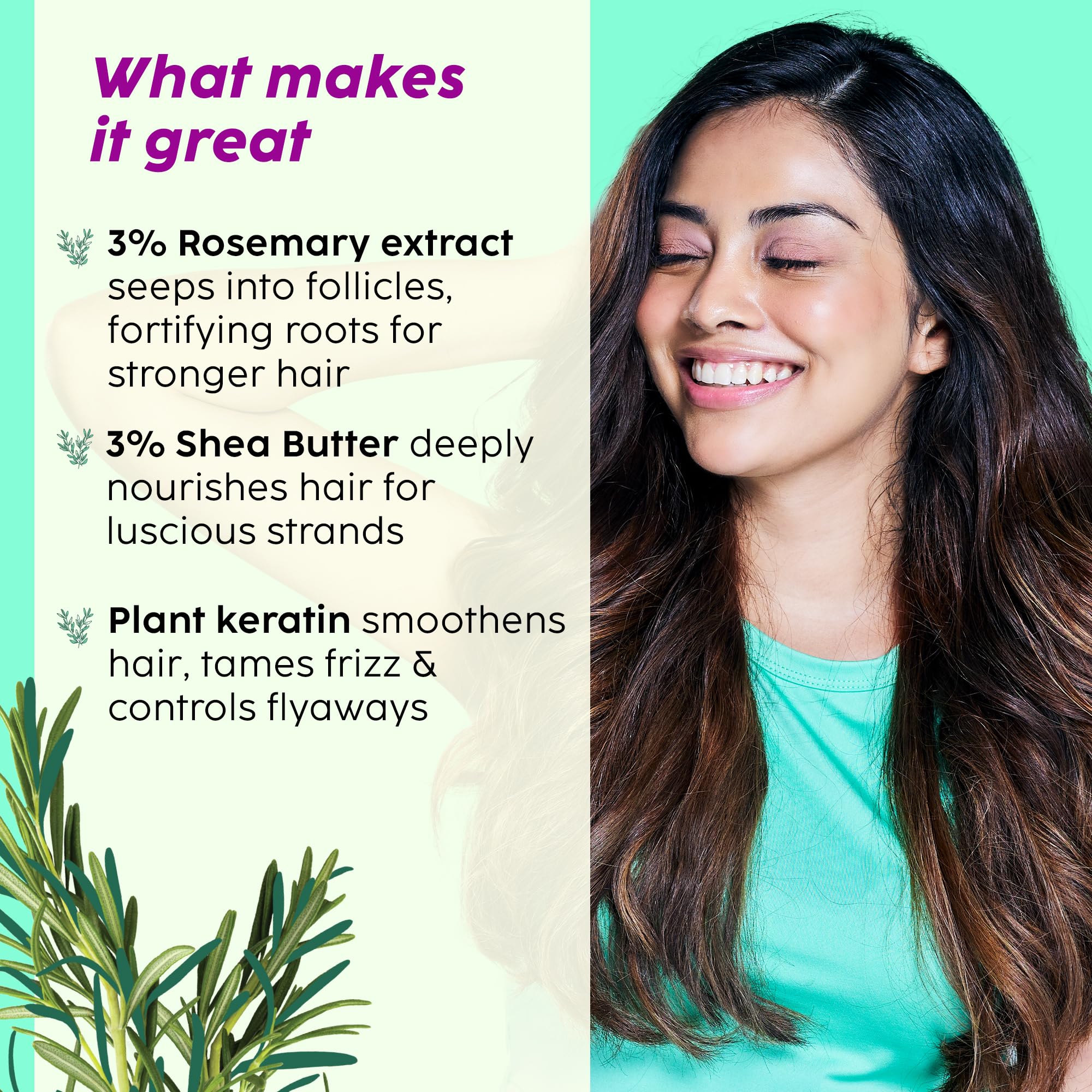 Reduces hair fall: Rosemary extract seeps into the scalp and rosemary oil improves blood circulation to the scalp leading to a reduction in hair fall